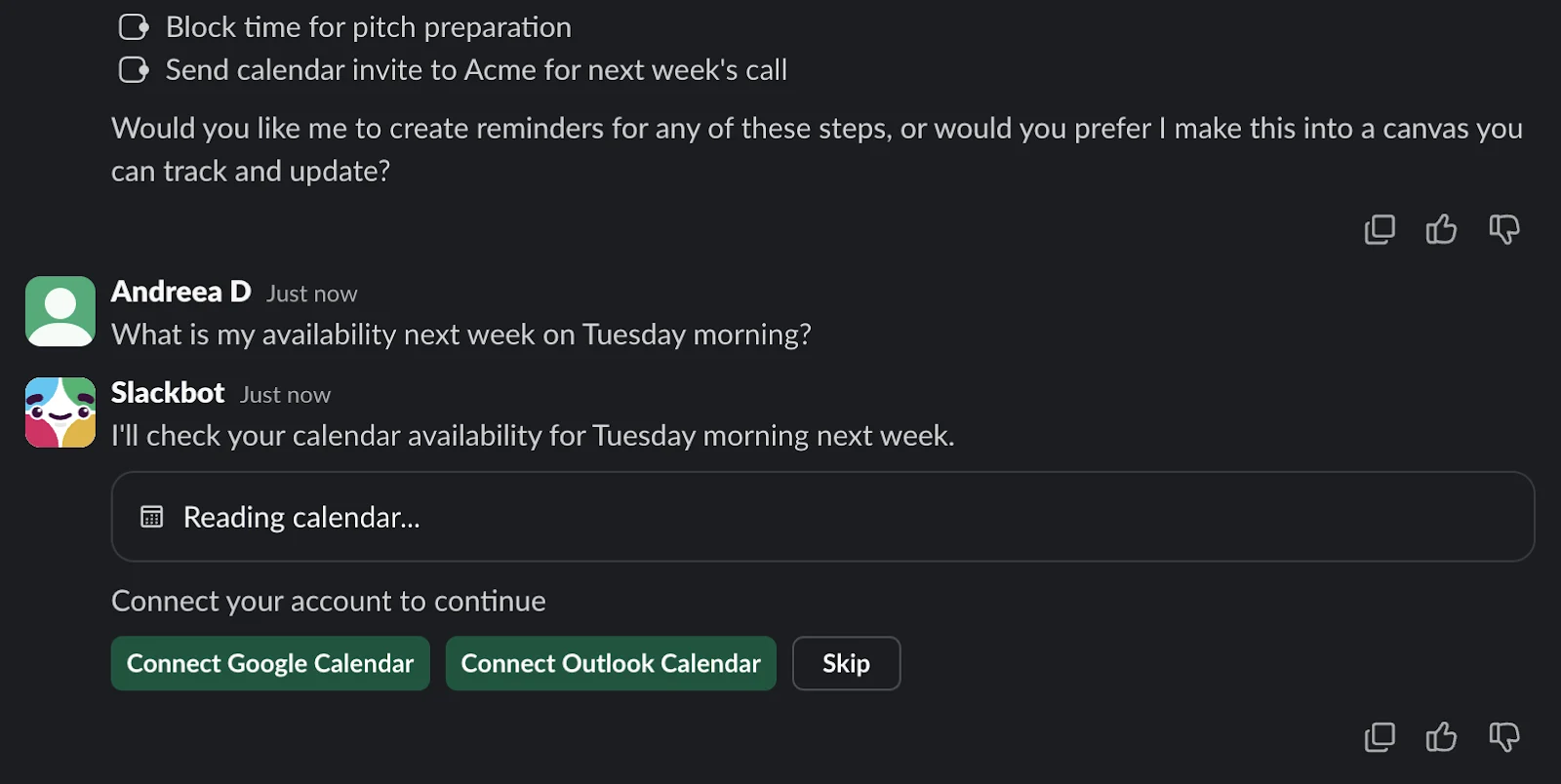 Additionally, the more access Slackbot has, the more helpful it can be. For example, connecting your calendar to Slack will open up the possibility for it to check availability, and not only for you! In a real-life scenario, finding the right slot between multiple team members across various time zones can be just as easy.