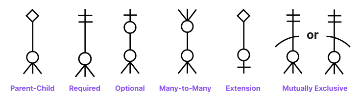 - Crow’s foot: Indicates the “many” side or “child” entity in a relationship.