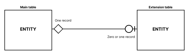 In this notation style, the diamond side of the line denotes the necessary main table, and the circle and line (|) of the line denotes that there can be zero or one related extension table, meaning that the main table can exist without extension table data, but the extension table data must always reference the main table.
