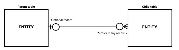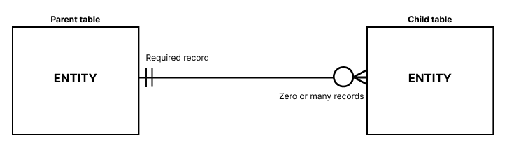 For required relationships as depicted above, a parent record can exist with zero or many related child records; however, a child record must have a related parent record to exist.