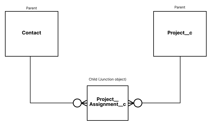 To reconcile this many-to-many relationship, a “junction” object needs to be introduced to define the instance of a particular record of each entity relating to one another (i.e., an individual employee managing a specific project).