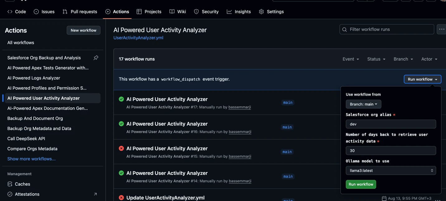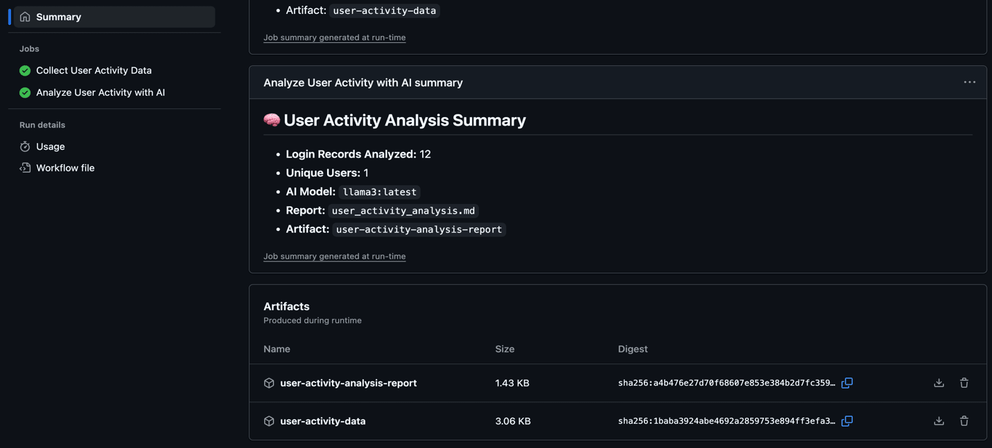 collect-user-data: Authenticates to your Salesforce org, queries user activity data (login history, user details, and security audit trails) for a configurable time window, and aggregates it into JSON artifacts.analyze-user-activity: Conditionally downloads the artifacts (only if data exists), sets up Ollama for local AI inference, and generates a comprehensive Markdown security report using the selected LLM model.