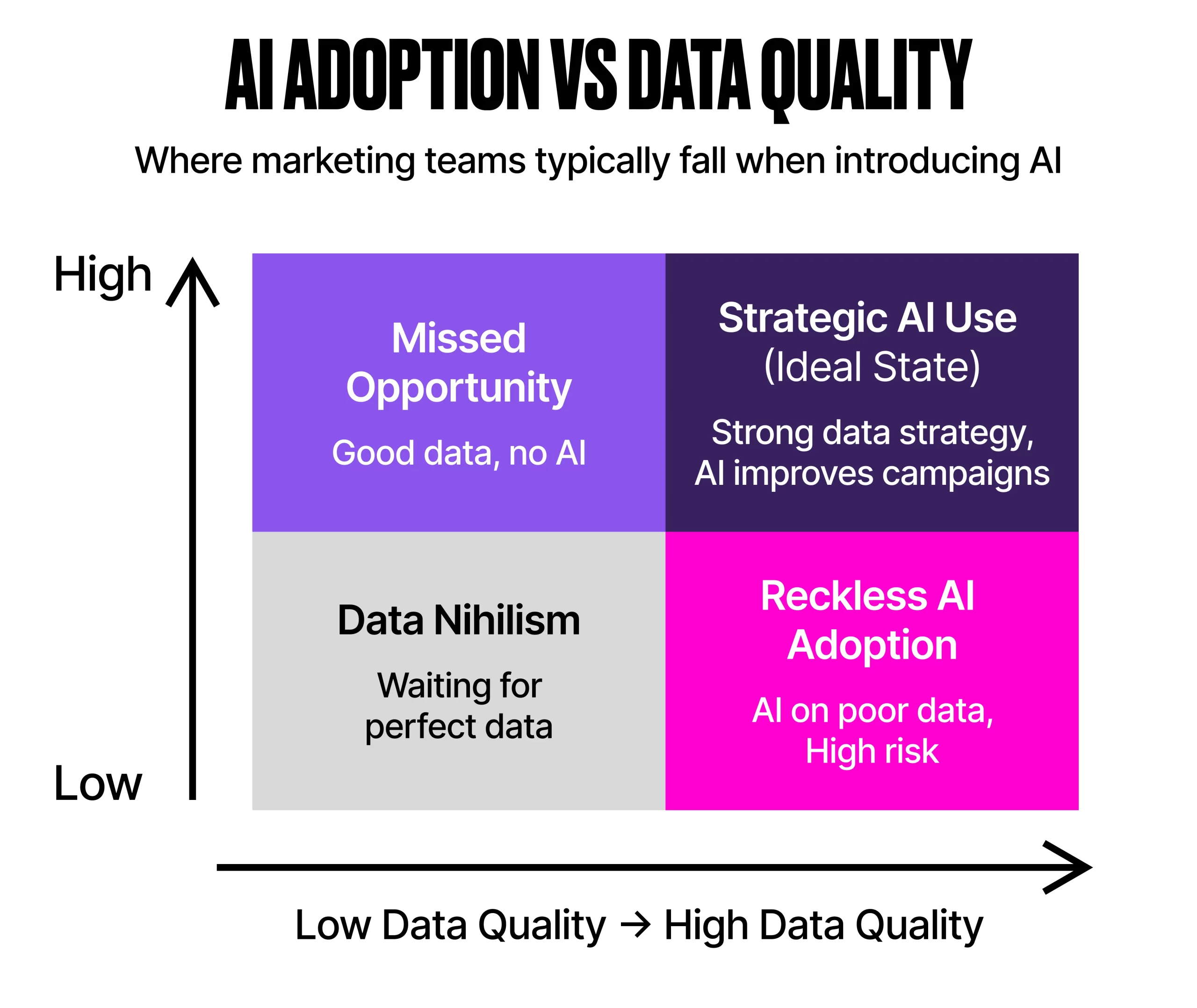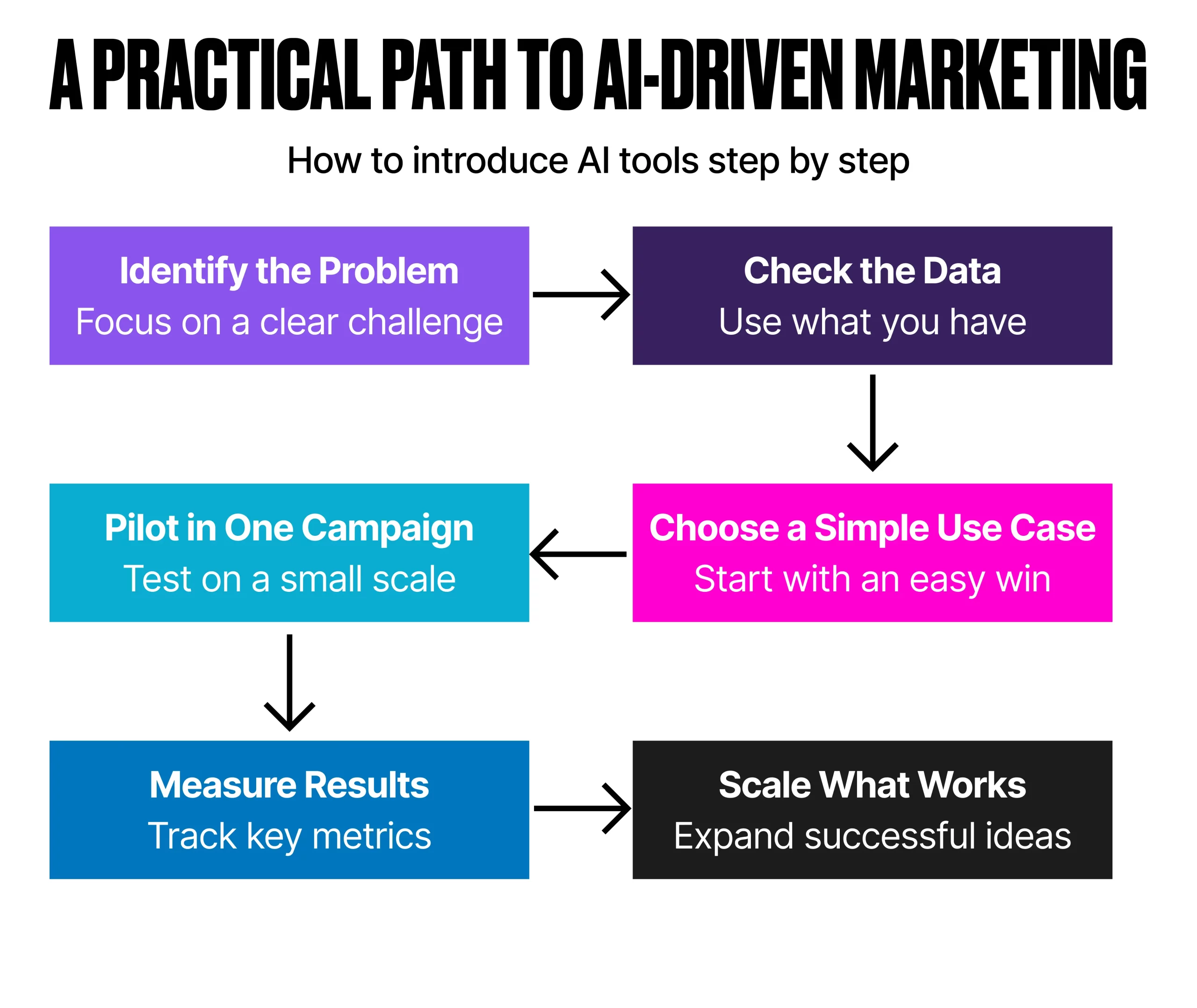 Introducing AI into marketing is neither about diving head-first into the most advanced features nor fixing every data issue up front. It’s about choosing the right problems to solve and applying AI to meet one challenge at a time. AI is great at exposing your strategic blind spots, so make the most of the learnings along your journey.
