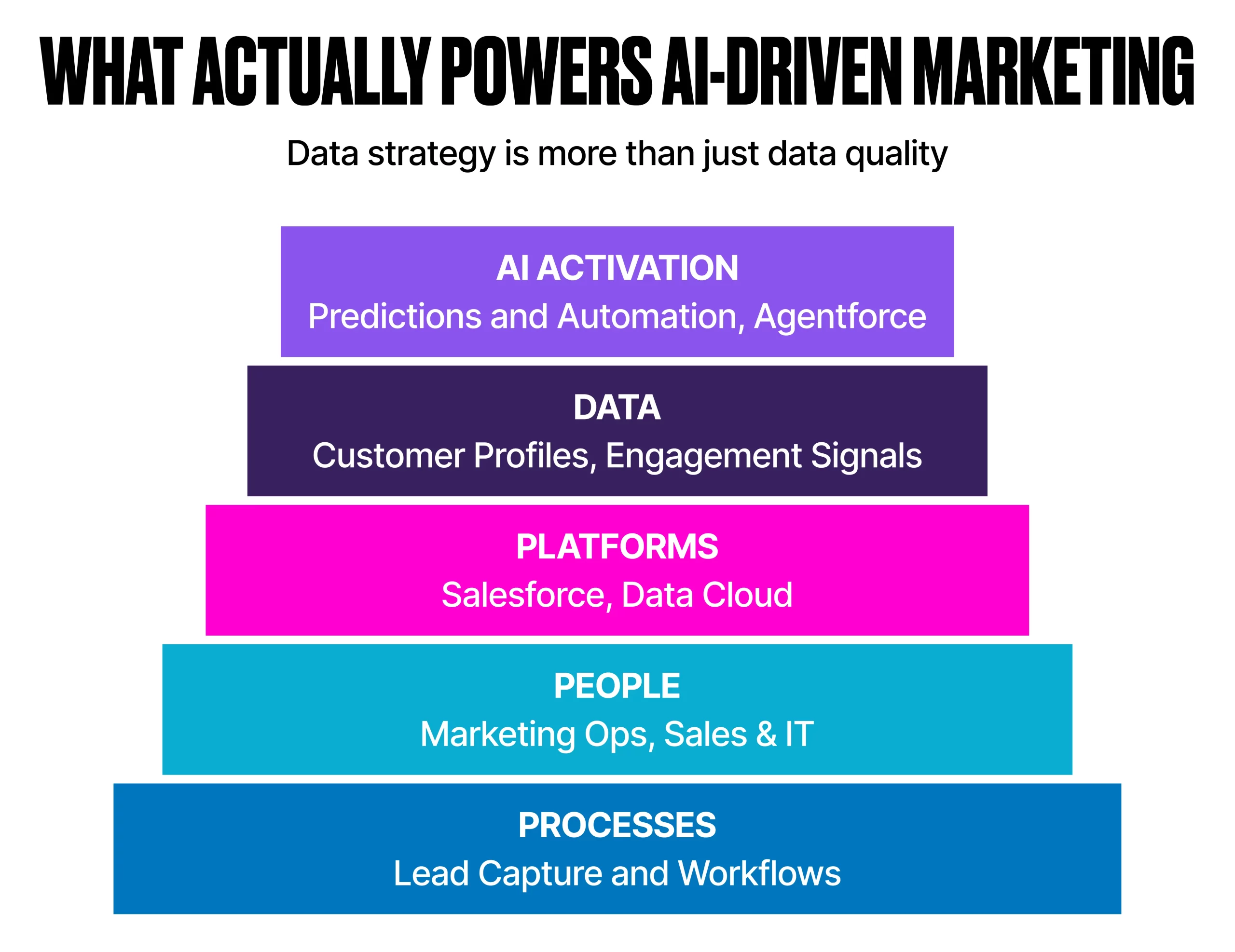 Autonomous AI cannot function without trusted real‑time insights. However, data quality is only one part of a successful data strategy. Data quality tells you how to reach your destination, not where to go or why. Too many marketing teams operate without a clear strategy, then wonder why platforms like Data 360 or Agentforce feel underwhelming. Without a clear strategy, you cannot expect to unlock the full value of your tech stack.