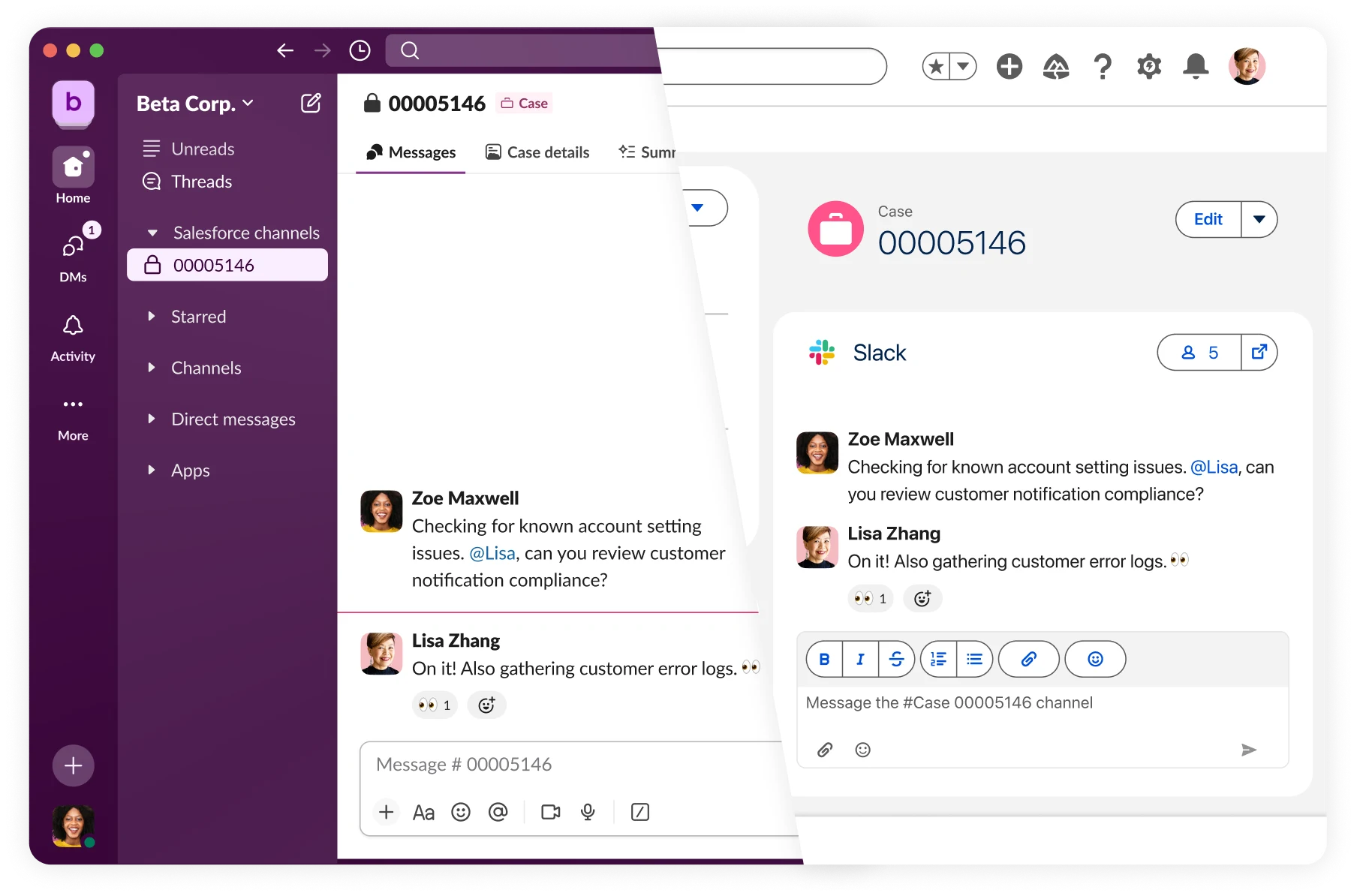 - Real-time collaboration replaces context-switching: When a deal stalls or a service case requires subject matter experts, the entire team can collaborate in a Salesforce Channel with live CRM data surfaced automatically. A service agent working in Salesforce won’t need to context switch to talk to a product expert working in Slack. Everyone can simply jump into a discussion right where they’re working, with the entire conversation tied to the record.