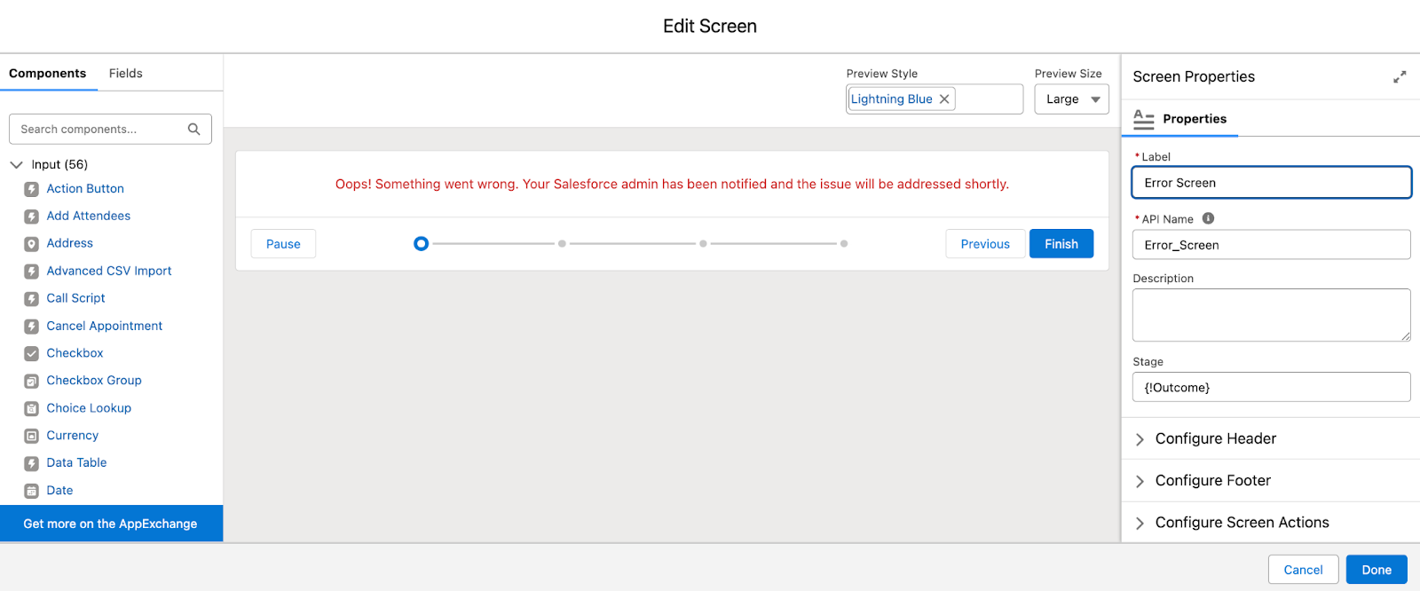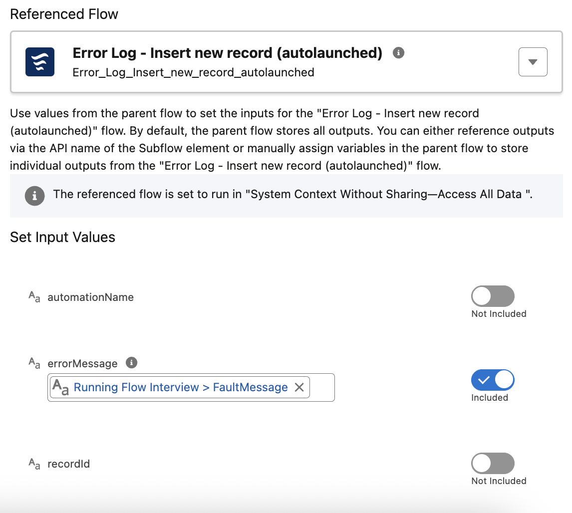 For all the scenarios in which the same steps need to happen once an error occurs, subflows are the perfect way to go about them! These are not a new type of flow per se, but rather either autolaunched or Screen Flows, which can be built once and then reused as many times as needed.