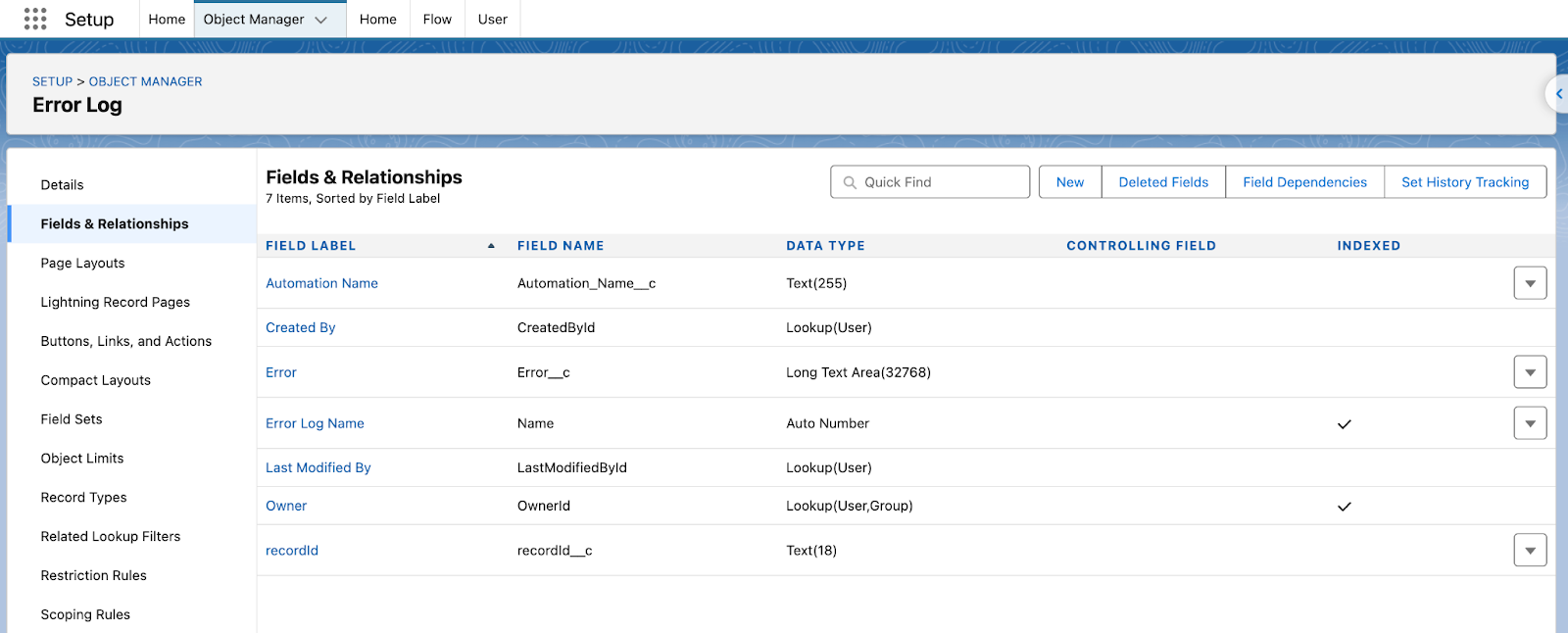 Returning to the Fault Paths, the first thing you need in this example is a custom object to store the errors in, which I called Error Log. Since this example is the build-it-yourself route, make sure to create all fields that may be relevant for troubleshooting down the line, such as Automation Name, the actual Error, and the recordId of the record that triggered the error.