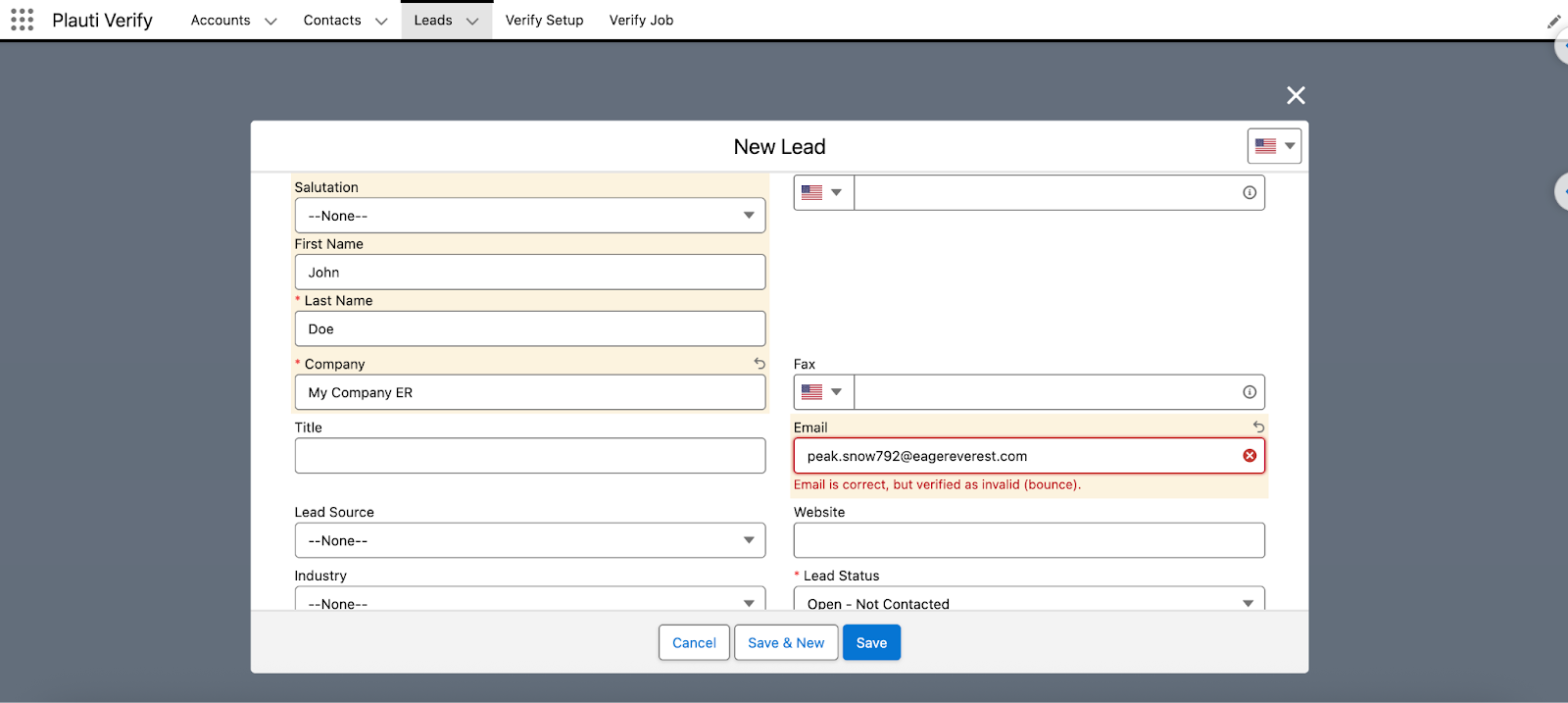 Continuing with the Lead example, whenever a new Lead is created, the configured fields will be instantly verified. In case of an invalid entry, the error message will be immediately displayed.