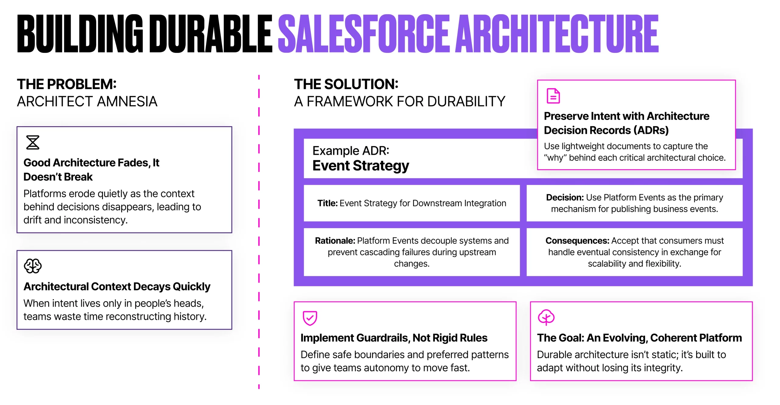 Picture this: a new architect joins six months after go-live, and they ask why Platform Events were chosen over Change Data Capture. No one in the room remembers. The original decision-makers have moved on, the meeting notes are buried, and the debate starts again from scratch, consuming time that should have been spent building forward.