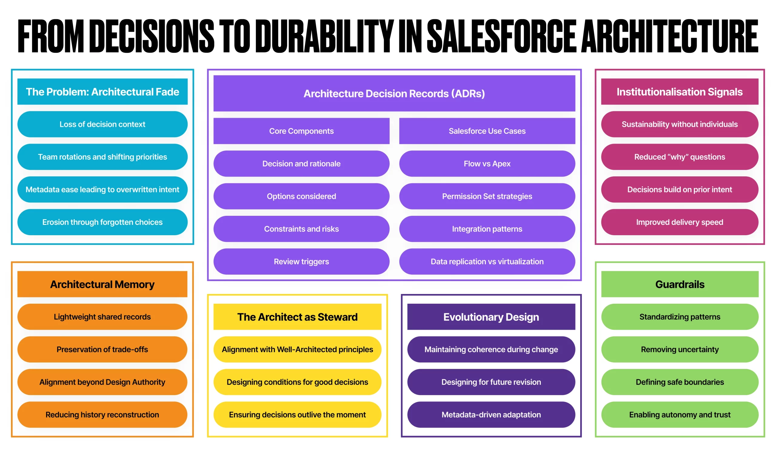 Salesforce evolves continuously: new features, new clouds, new integration patterns. Architecture that assumes stability will eventually break. Architecture that assumes change, and designs for it explicitly, can evolve without reintroducing fragmentation or drift.