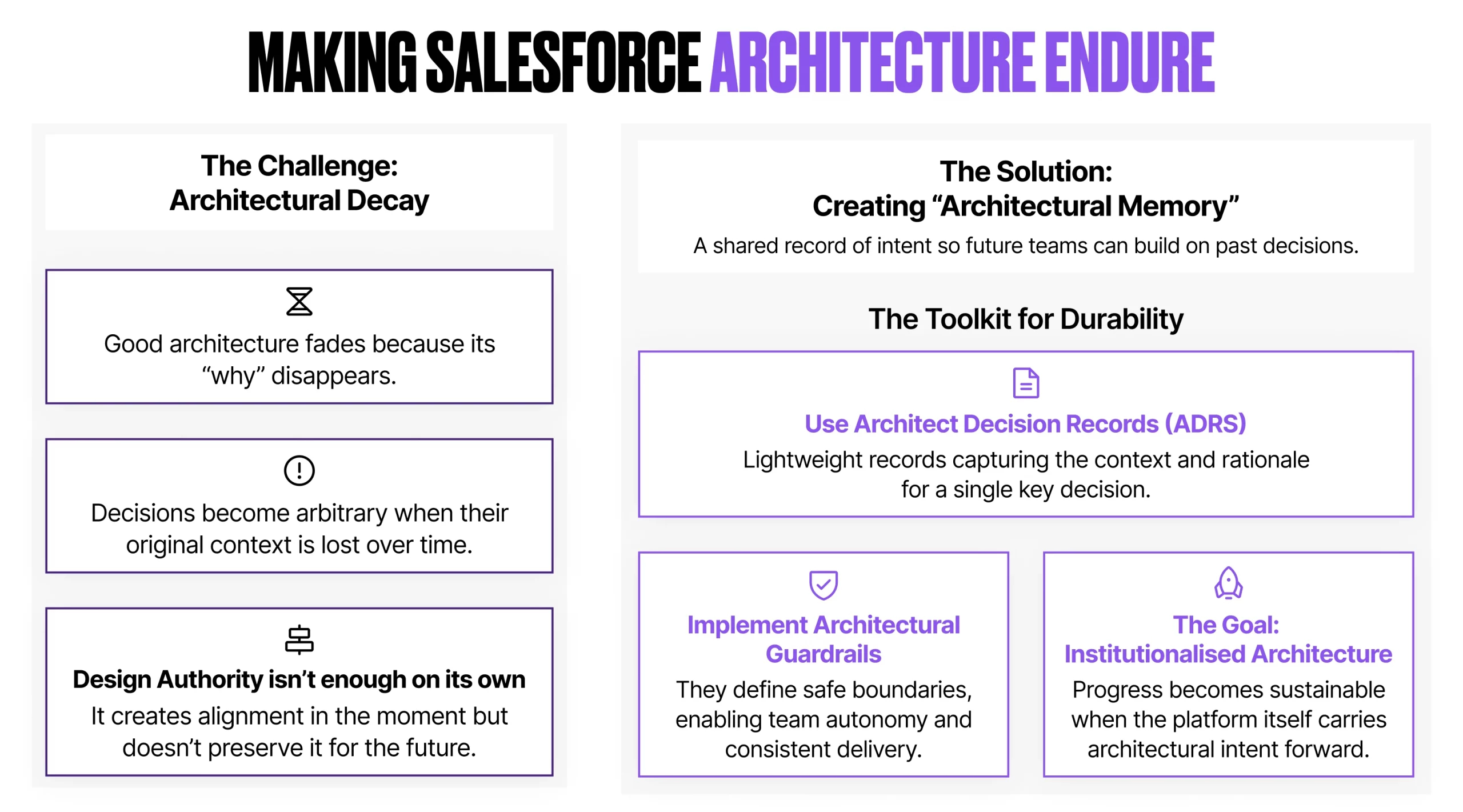 Early in a Salesforce program, architectural intent is usually clear. Key decisions are discussed, trade-offs are debated, and patterns emerge. But as teams change, priorities shift, and delivery accelerates, the reasoning behind those decisions fades. What remains are the outcomes – objects, flows, integrations – divorced from the intent that shaped them.