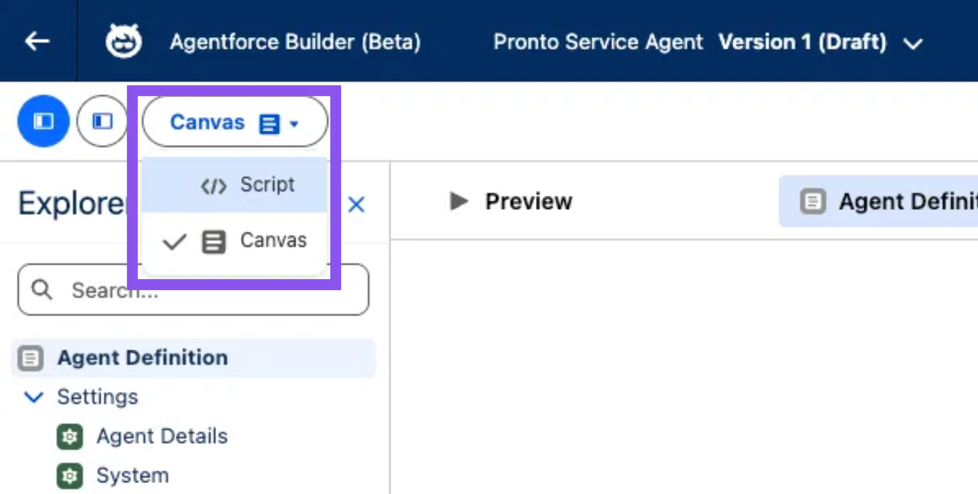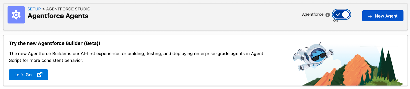 Agentforce Studio gives you two ways to work with agents, and you can switch between them freely using the dropdown (just like how you switch between Free-form and Autolayout in Flow Builder!).