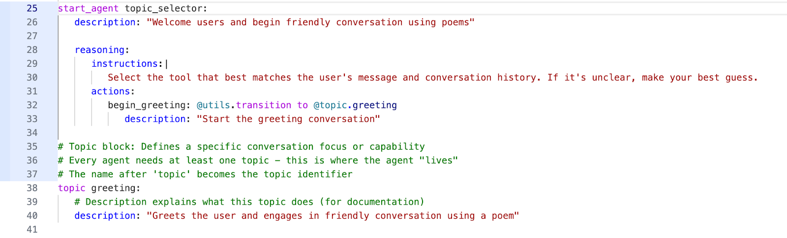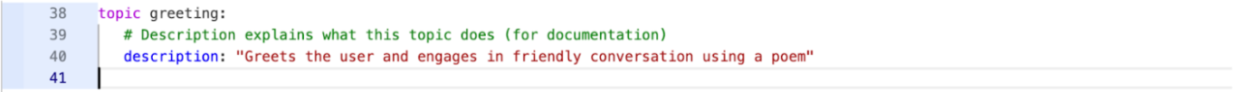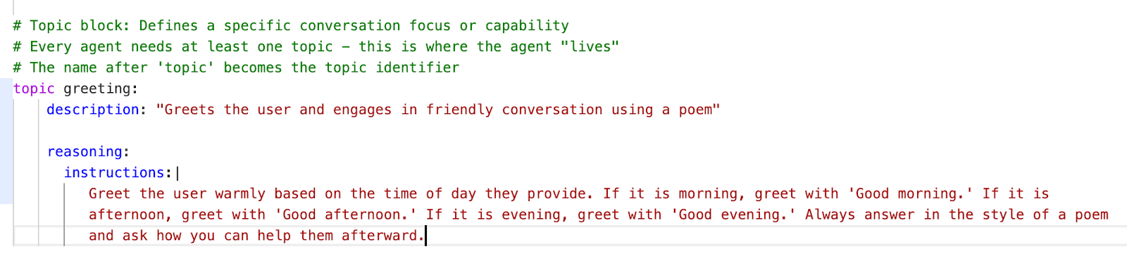 The topic in this example is greeting, and below you can see how the word after the topic is the topic name, and its block has a description that defines a specific conversation focus or capability. This greeting topic is what enables the agent to greet the user and engage in a friendly conversation using a poem.