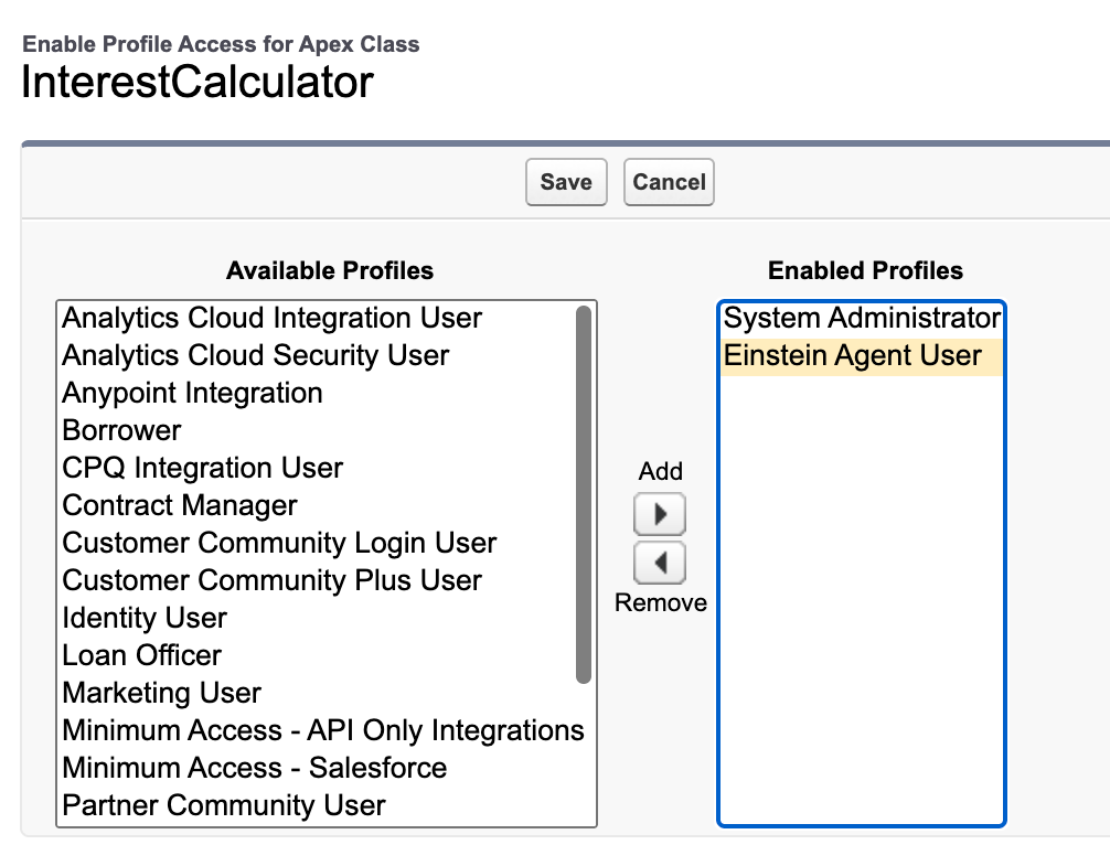 Go to Setup → Apex Classes and click the Apex class you want to use. Click Security and add Einstein Agent User to enabled profiles, then Save.