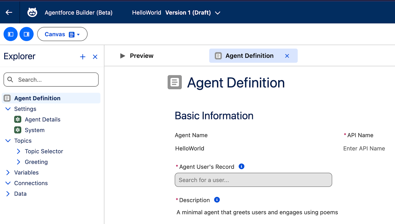 If you’ve been working on Agentforce before, you will be more familiar with the way to operate in Canvas mode. It is a straightforward, no-code interface for configuring agent topics and actions, and is great for getting started and understanding agent flow at a glance.