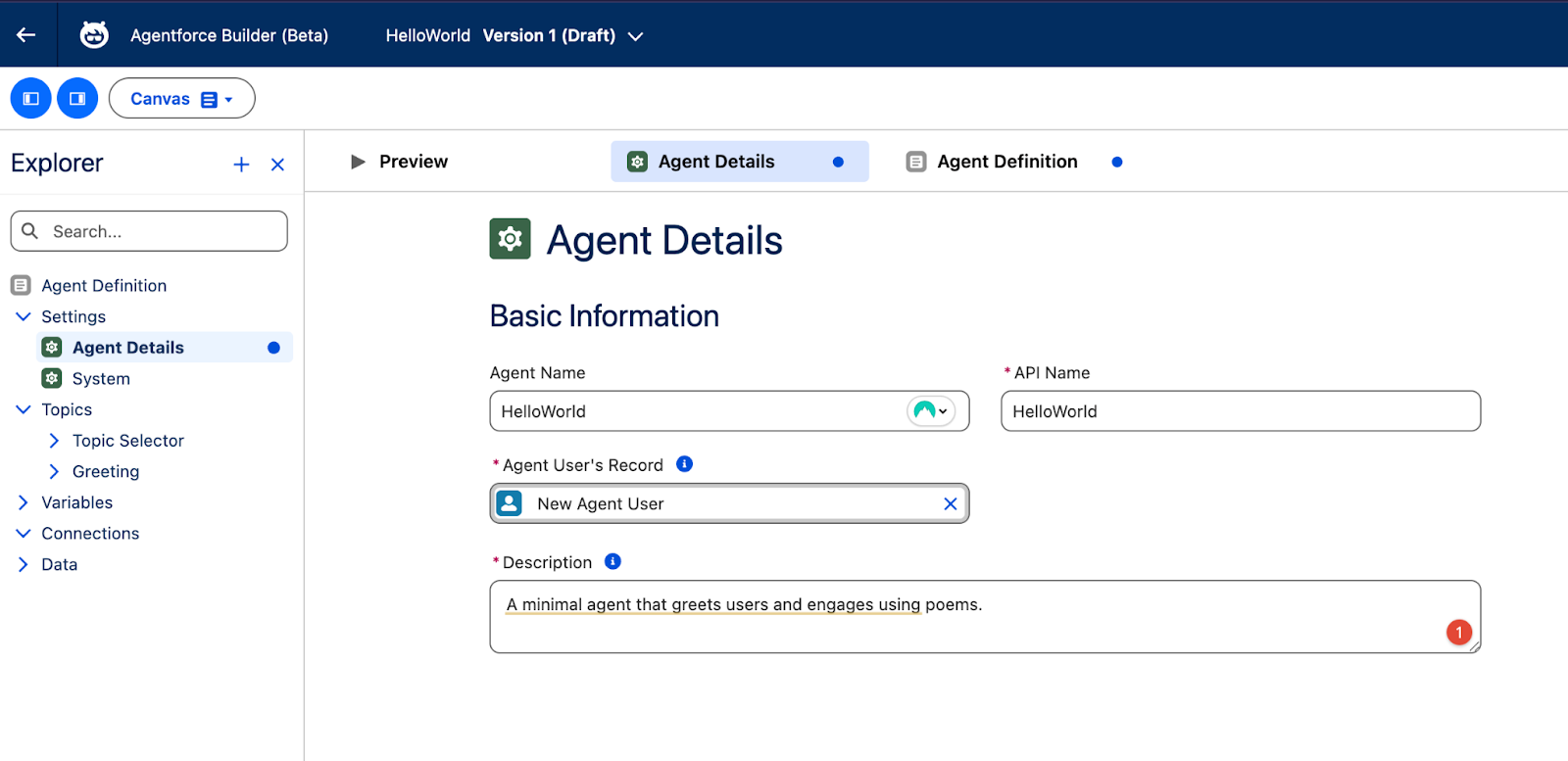 On the left side is the Explorer sidebar, which shows you parts of your agent configuration – similar to Flow Builder’s sidebar. Go to Agent Details and fill it out to get started.