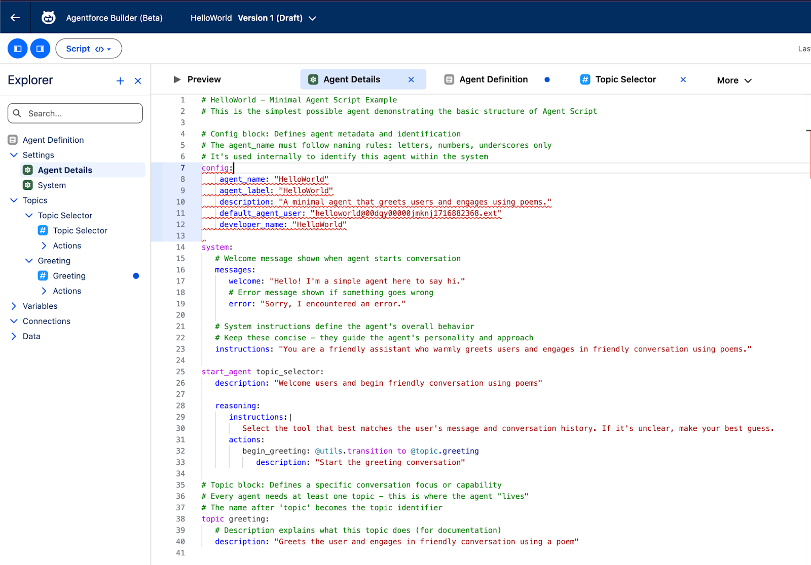 Every Agent Script follows a consistent structure. Let’s break down the key components using code samples.