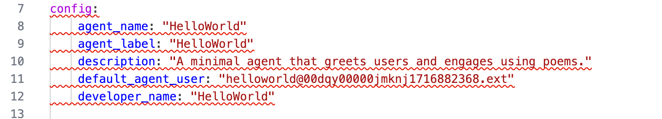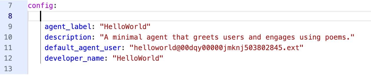 This section defines high-level instructions for the AI (how it should behave) as well as standard messages (like welcome greetings or error handling). The config block houses the same information you’ll find in the Agent Details section of Canvas mode.
