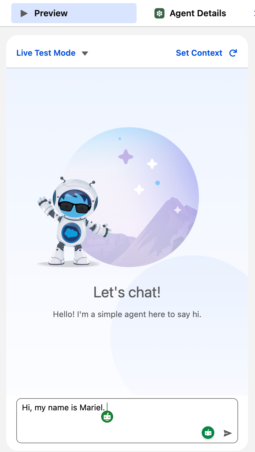 The Preview tab lets you test your agent in real-time as you build it! Just click the Preview tab in Agentforce Studio and type a message as if you were an end user.