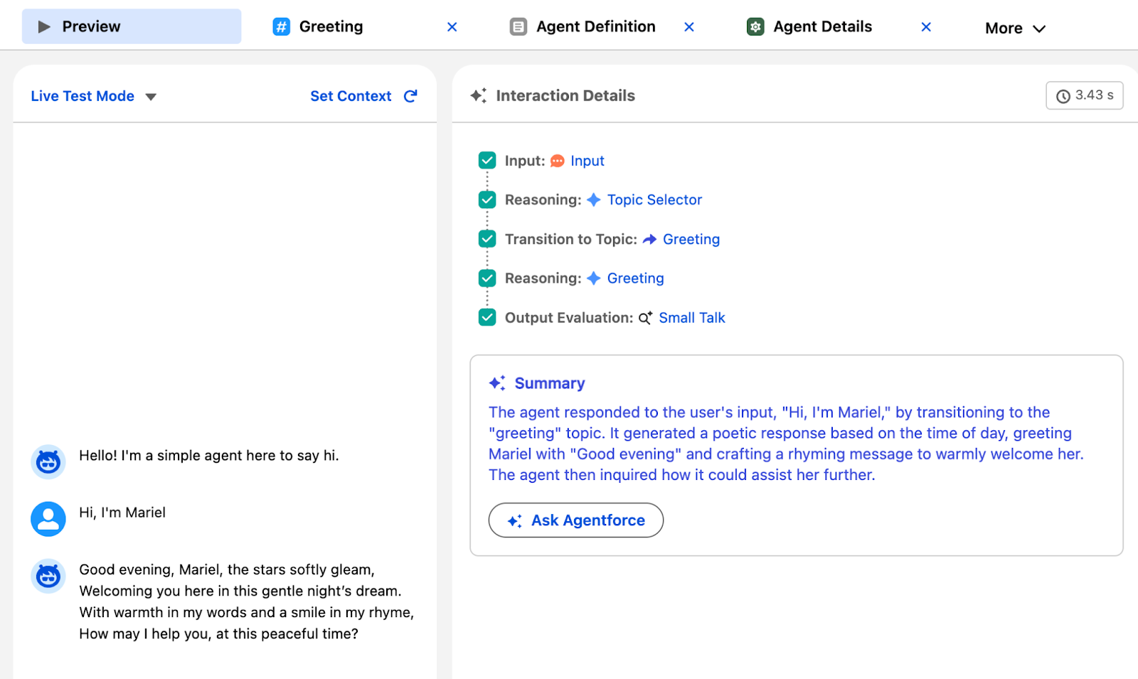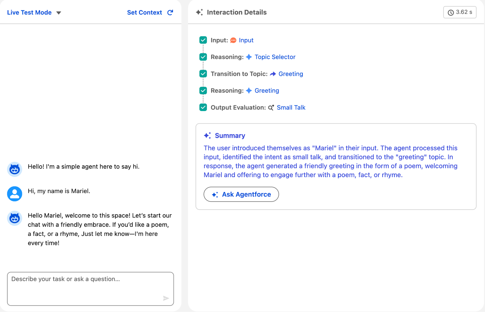See how your agent responds based on your configuration. Once the agent gives a response, the right side shows interaction details so you know what’s going on behind the scenes. You can see the AI reasoning combined with your precise logic in action.