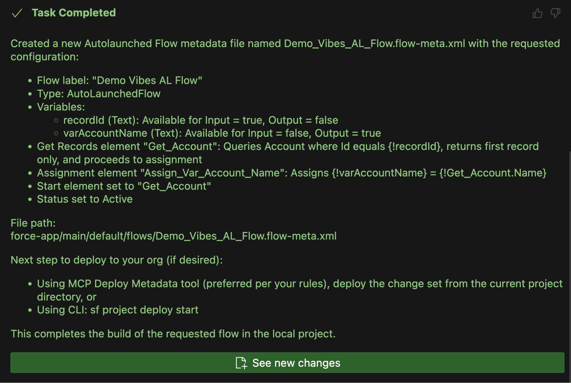 Almost immediately, before my very eyes, Vibe Codey acknowledged my request and began building out the Flow XML file.