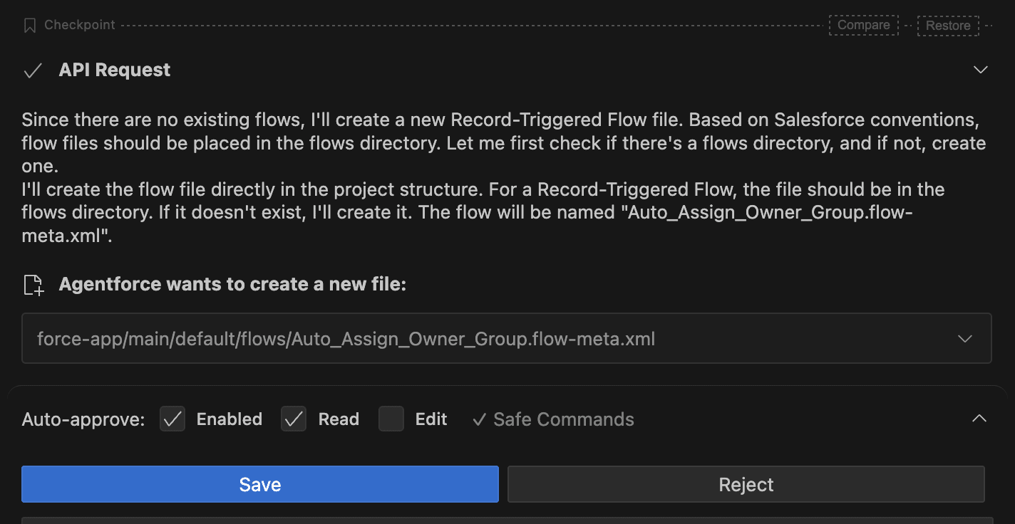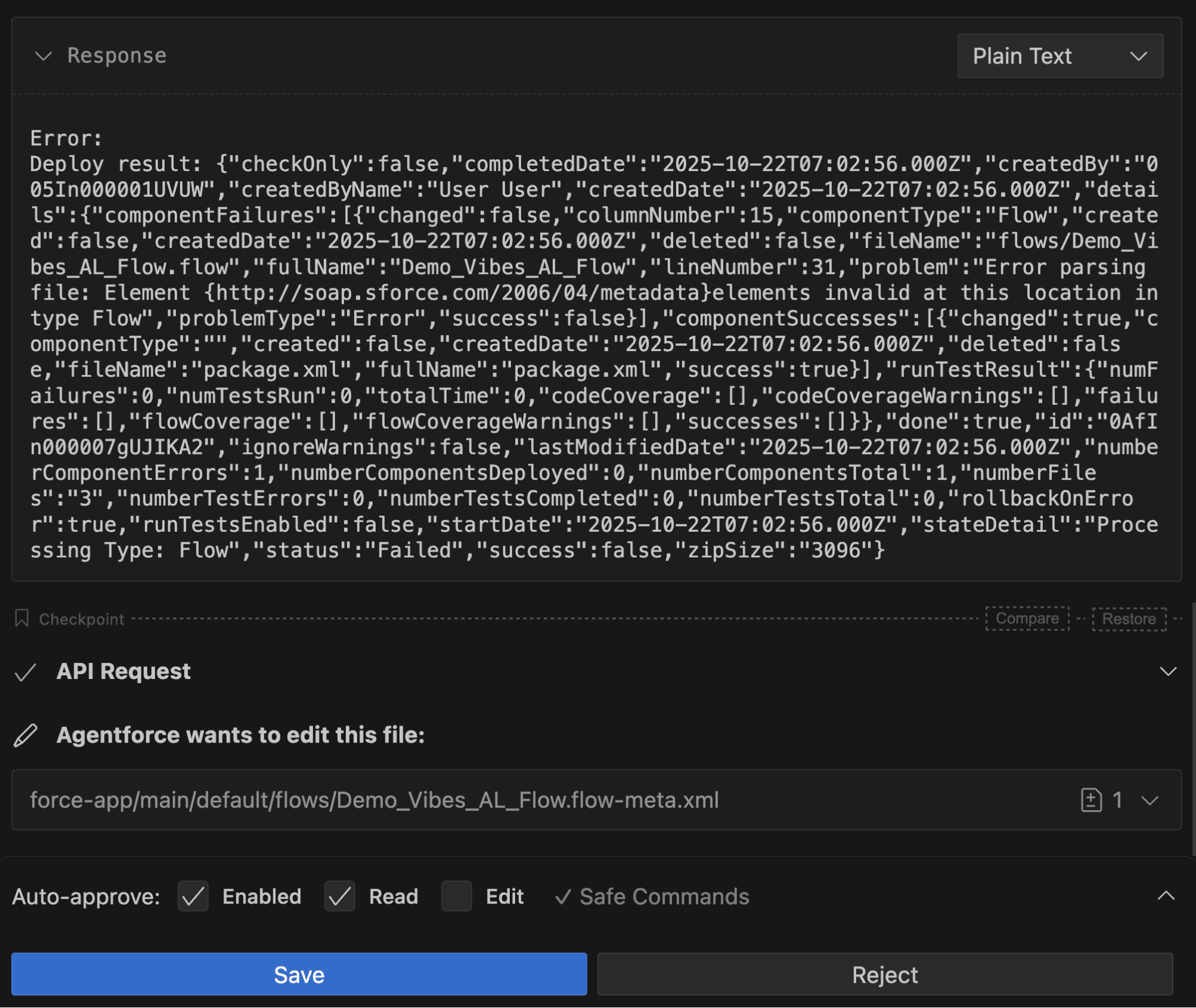 My worst fears were realized after the first deployment attempt. Without saying a word, Agentforce Vibes requested the ability to edit the Flow, which I, of course, granted.