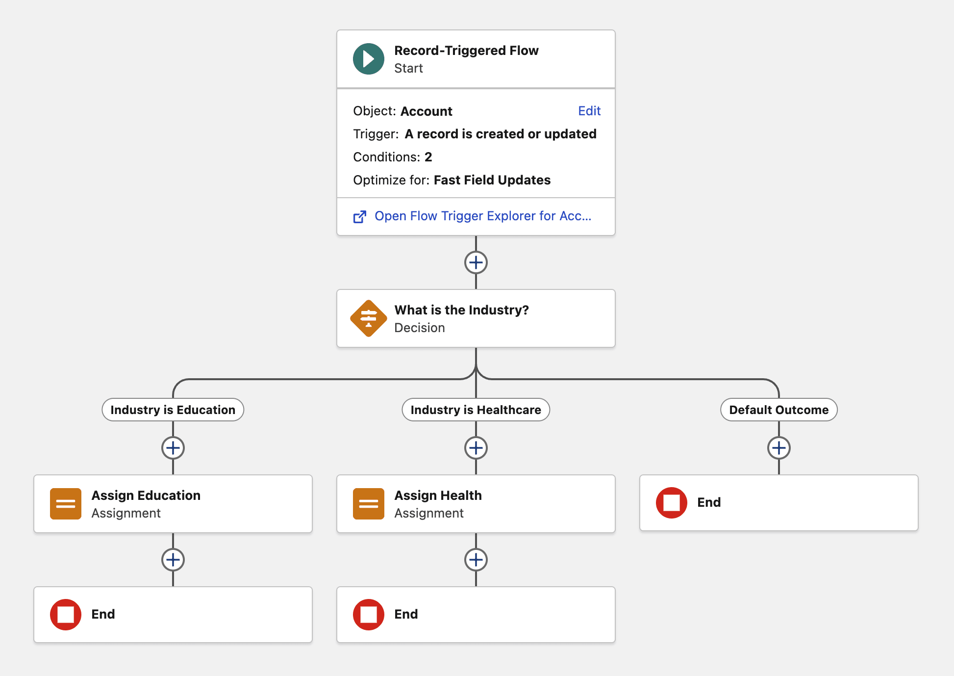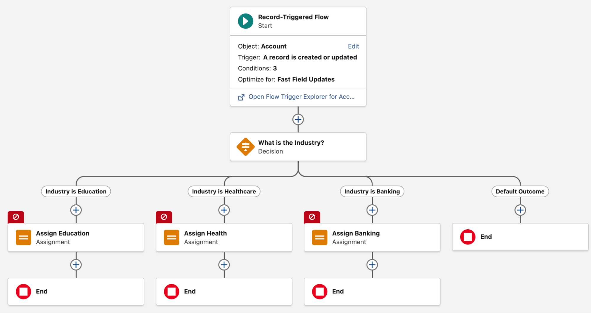 There’s a Flow called Demo_Account_RT_Flow. Currently, it assesses the Industry field on the Account and checks for two values: Education or Healthcare. It then sets the Owner_Group__c field based on which of these is set. I want you to add a new Decision path. Check for if the Industry field is equal to “Banking'” and if it is then set the Owner_Group__c field value to “Banking Group“. Make sure to change the Entry Criteria to include this Industry value too.