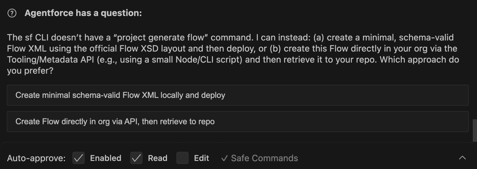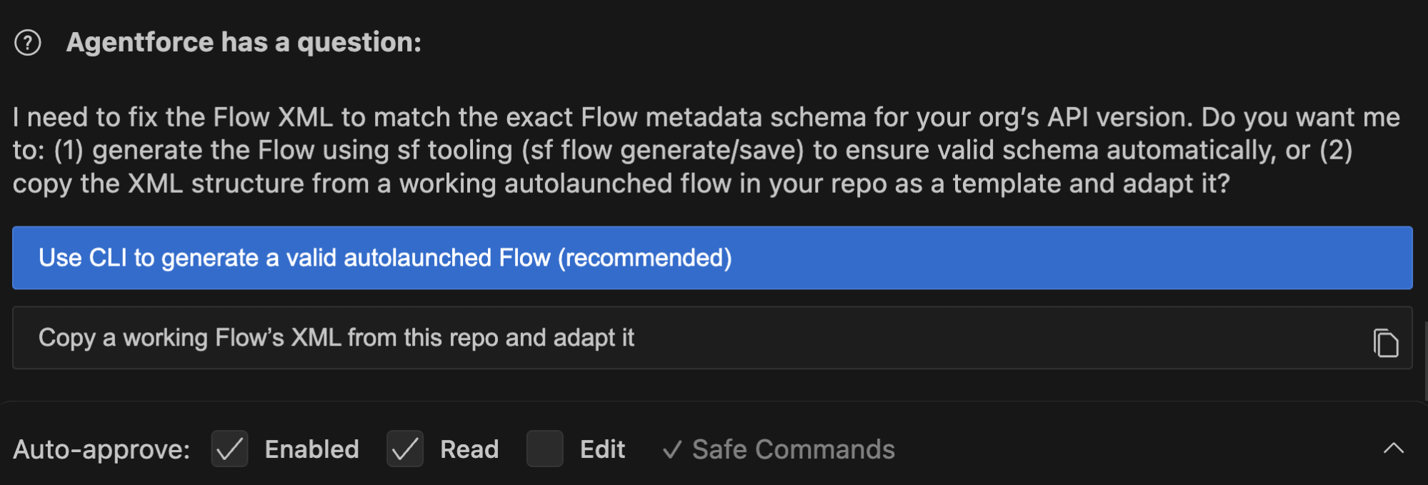 Then, suddenly, Agentforce proposed two options moving forward. It had been identified that the format of the Flow XML was the issue and that it needed to get it right before attempting to push it again. It suggested that it could either use Salesforce CLI tooling to generate a new XML file that followed the correct structure (which I’m surprised it didn’t do from the start, something that I’ll need to suggest in my prompt next time), or it could attempt to pull another working Flow to assess and use to restructure its own.