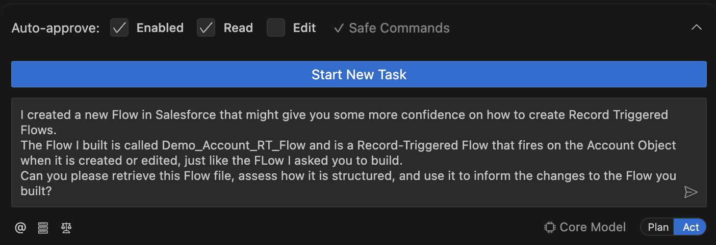 Once it made this final change, it told me that the task (what it believes is the command I have given it in my prompt) was complete! It had built a new Record-Triggered Flow with the trigger criteria and entry criteria that I had specified.