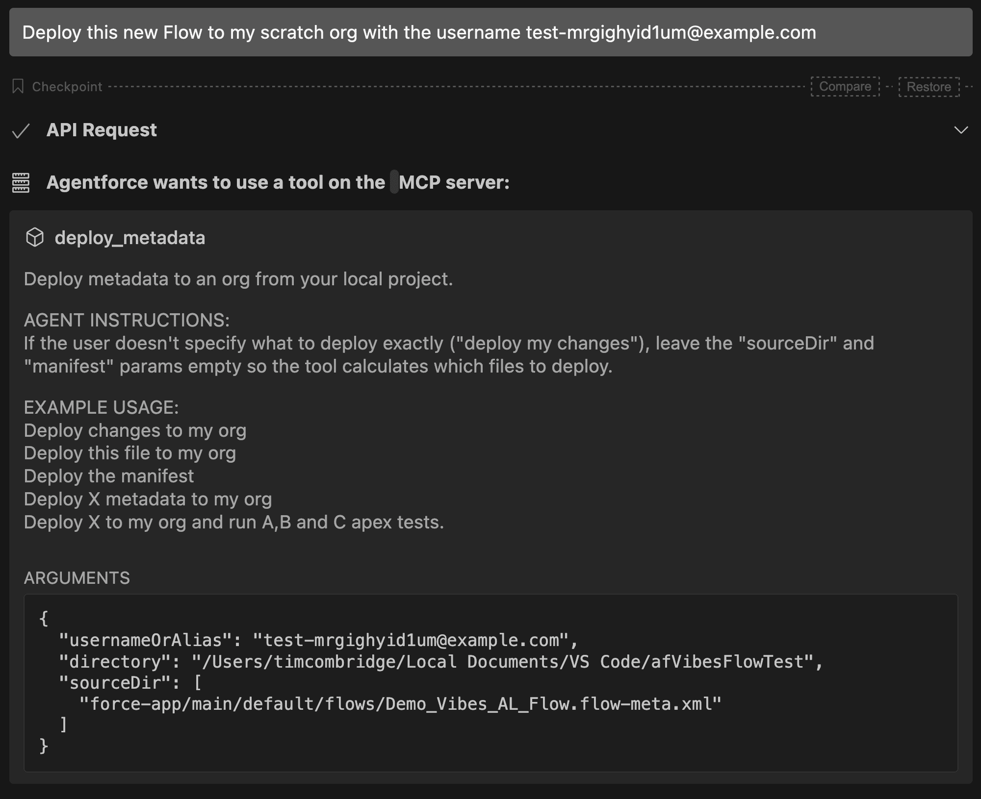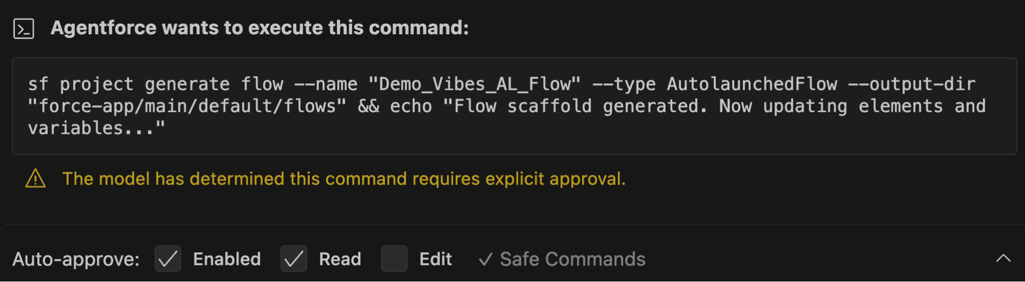 There was only one way to find out, so I then instructed Vibes to deploy the Flow to my scratch org. My heart rate increased all the more. I approved its request…