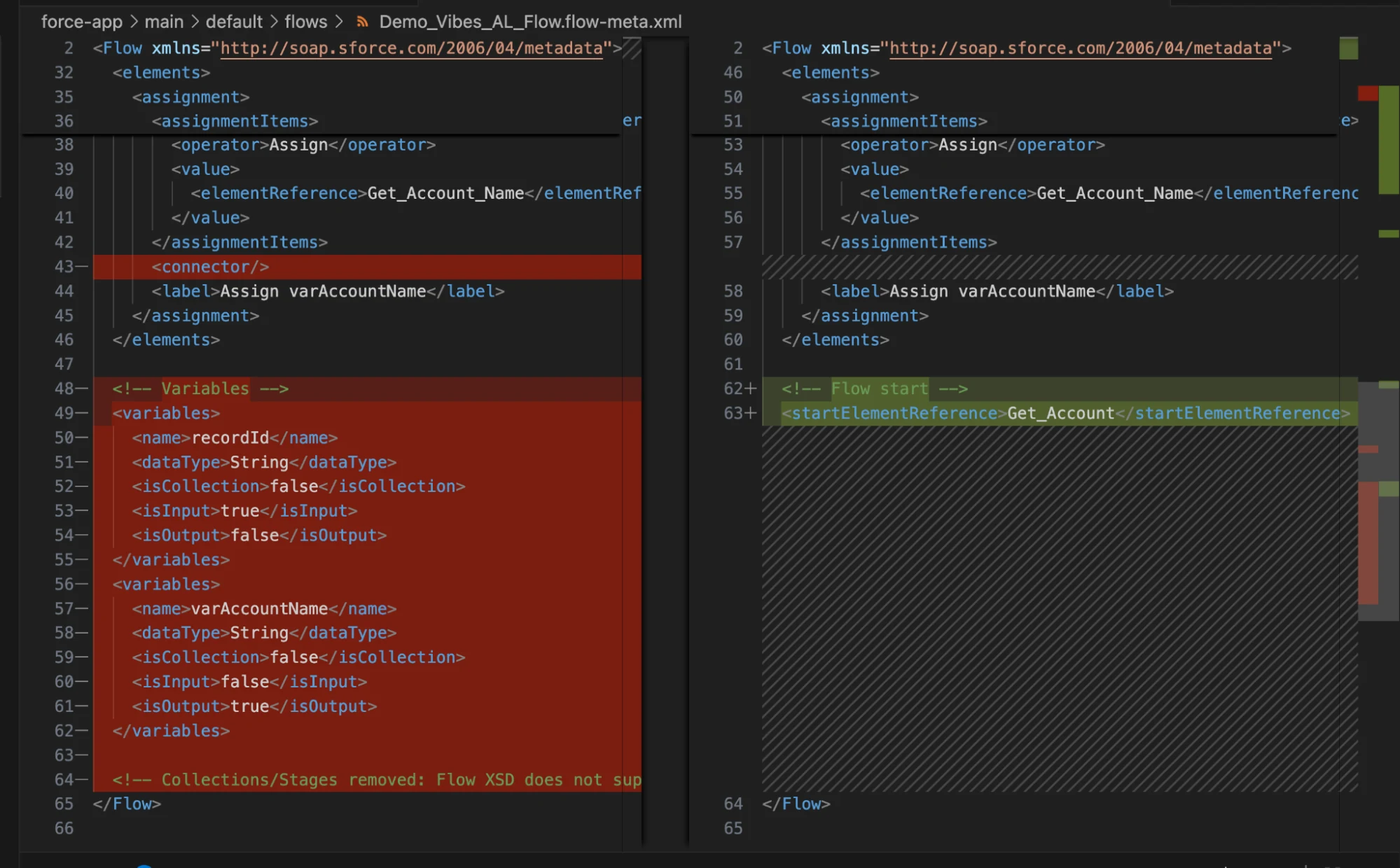 After a few attempts, I wondered if I could help it on its way. I decided to build pretty much the Flow that I was asking for manually in Salesforce (imagine having to manually do things in the era of vibe coding – wild!) and told Vibes about it. I asked it to retrieve the code from the Flow that I had built, which followed the correct format as it was built inside of Salesforce, and to restructure the Flow that it had built to match.