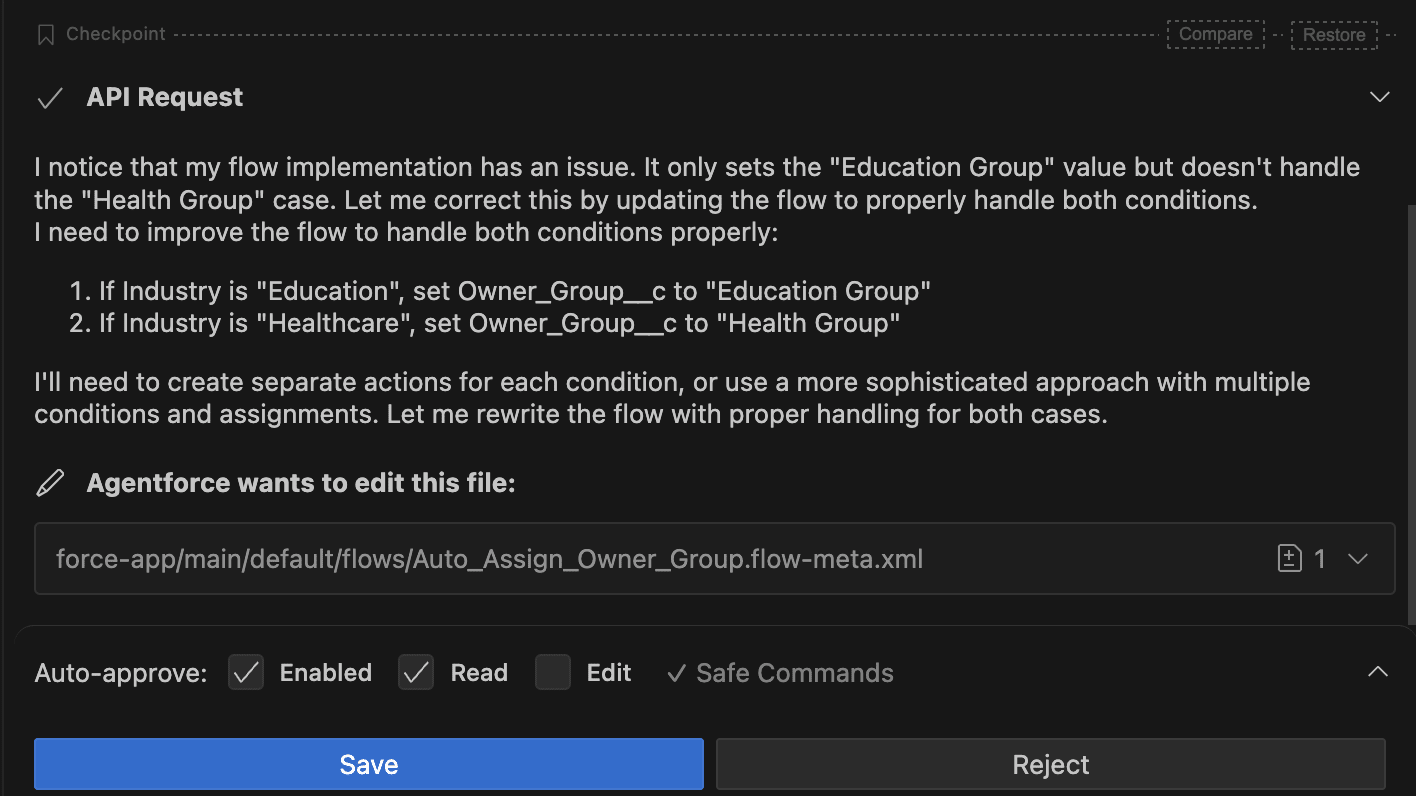 It’s now or never. Agentforce Vibes took my instructions and began making changes to the Flow XML. I read the proposed changes before clicking “Save”, and everything seemed to make sense.