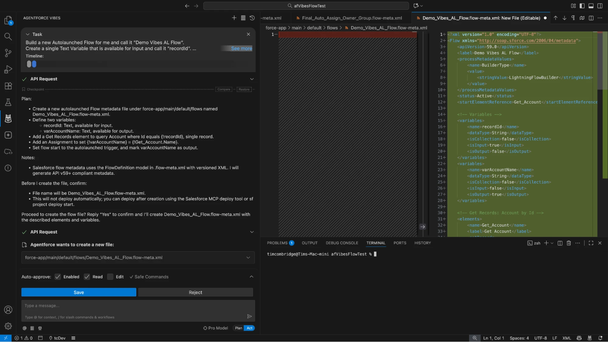 Next, I asked Vibes to push its wonderful new Flow into the scratch org that I had built earlier (which had the Owner Group field in it already). This is where I started to encounter errors. Unfortunately, it seems that the XML that was built was not correct, and Agentforce Vibes started to have a few hiccups and errors.