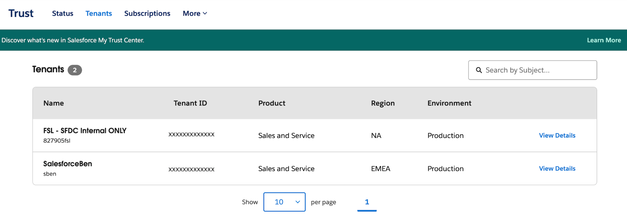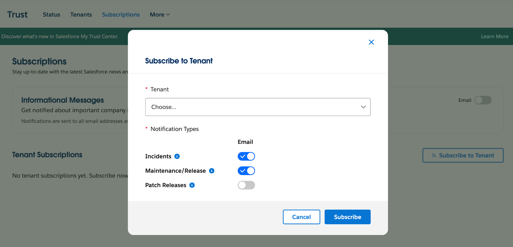 Notifications are now more targeted on Personalized Trust. Because the experience is authenticated, subscriptions are now tied to your org and the products you use. Just click the Subscriptions tab and then Subscribe to Tenant.