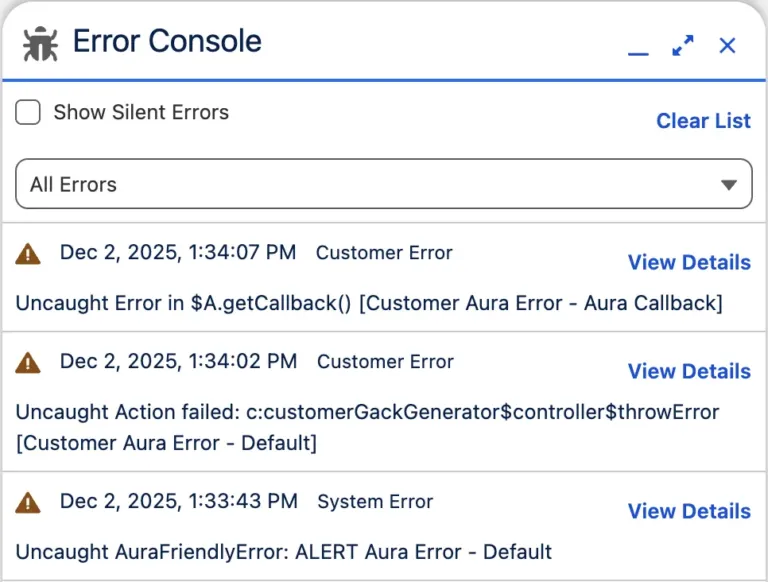 Spring ’26 introduced the Error Console, a central place to see and manage page-level errors in Lightning Experience. No more hunting through scattered logs or ignoring silent issues. Now, all errors, both fatal and non-fatal, are surfaced in one place, making it easier to spot recurring problems, figure out where they’re happening, and fix them before your users start reporting broken pages or weird behavior.