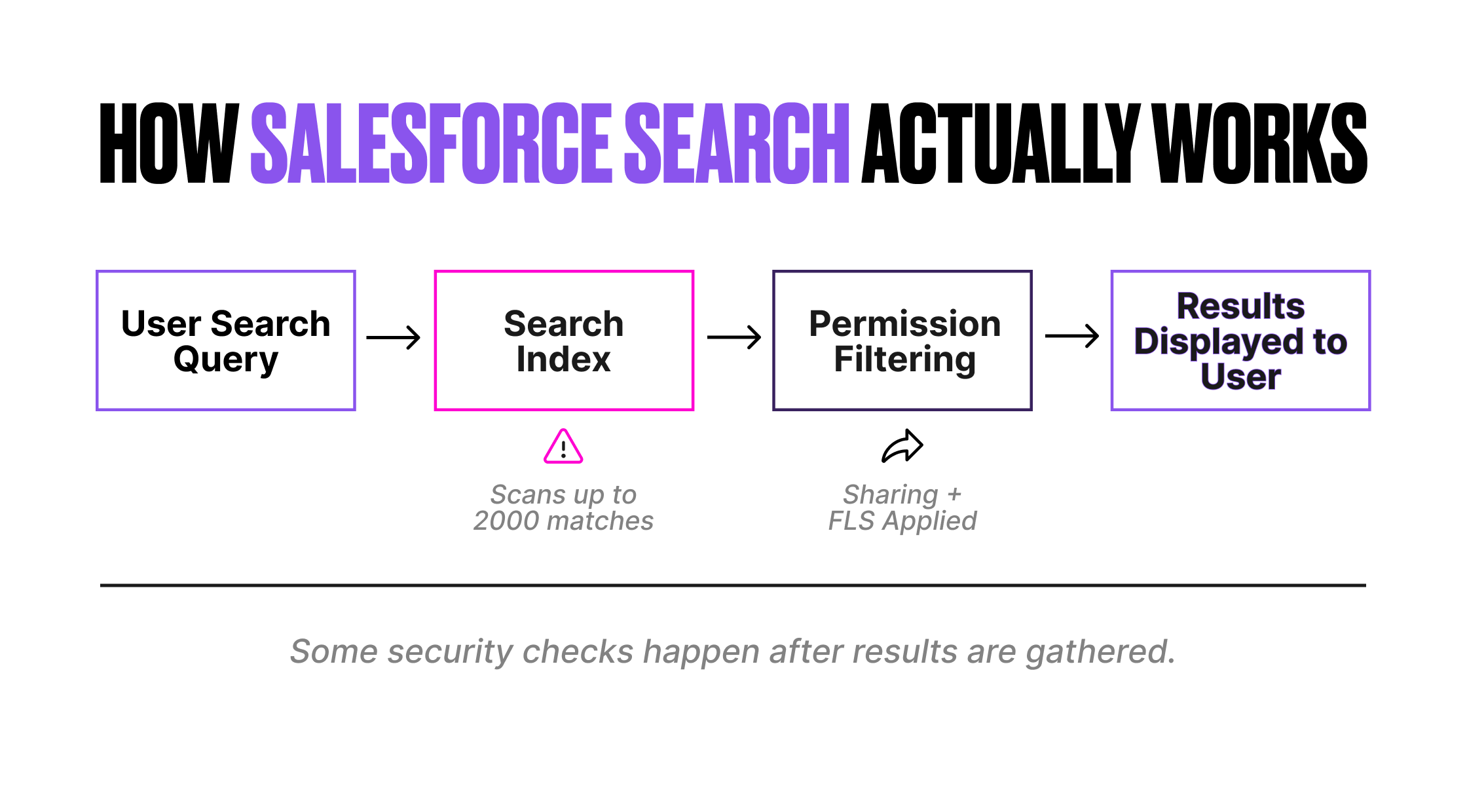 The Salesforce search engine has a fundamental architectural choice that creates an indirect security consideration: sharing and permission checks are applied after the result set is returned from the search stack, not during the search itself.