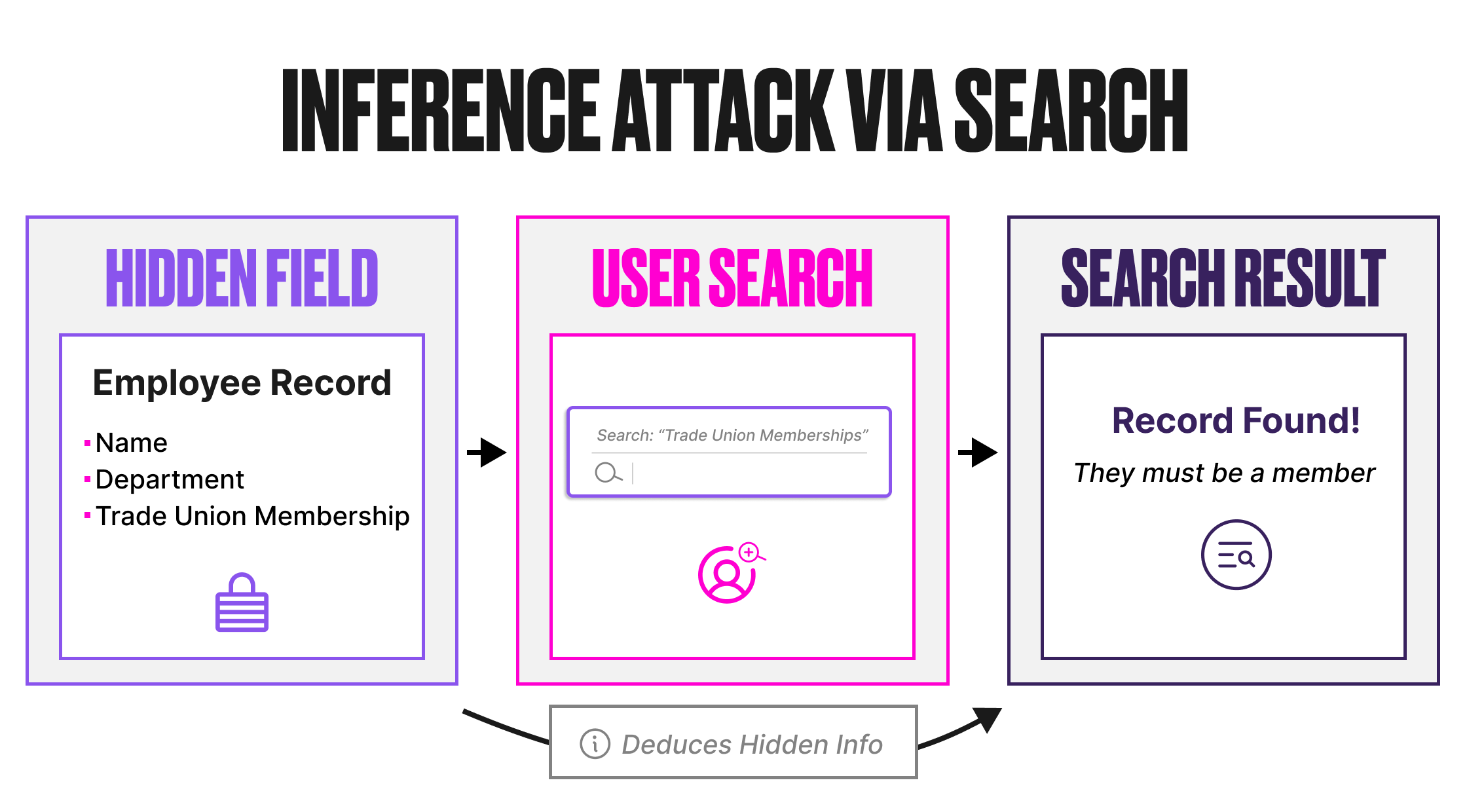 A non-HR user searches for “Employees with Trade Union Membership”. The search engine scans the index, matches against the unprotected Trade Union Membership field, and returns the Employee records where that value exists. The user can see the records (they have object and record access), but the Trade Union Membership field is hidden. The user can’t see the field value, but the fact that those specific records appeared in the search results for that specific query reveals the membership information.