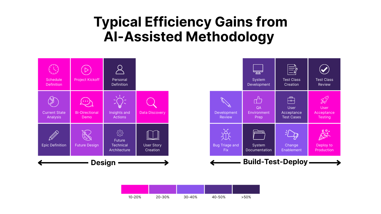 The chart below highlights where AI-assisted delivery can create efficiency gains across the Salesforce project lifecycle. Rather than focusing on a single activity, AI can support a range of tasks spanning design, building, testing, and deployment.
