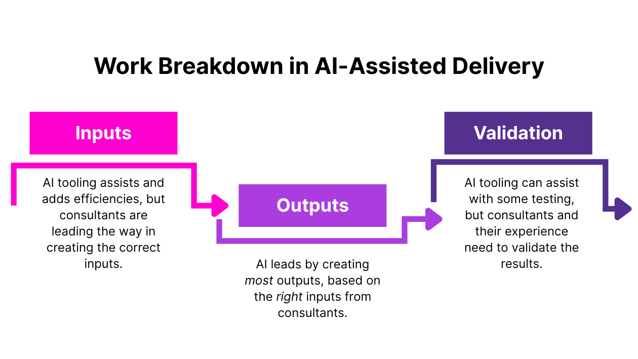 The graphic below illustrates the division of labor between AI and human consultants in an AI-assisted delivery model. It breaks work into three main categories: