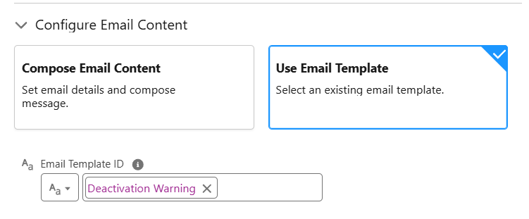 Give it a label and description, then scroll down to Configure Email Content. Select Use Email Template, and add your email template under Email Template ID.