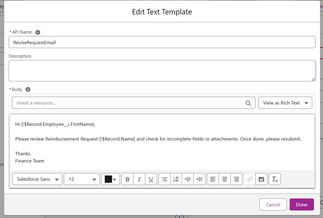 If you already have an existing Text Template resource in your Flow, you can call that out from the Send Email action as well. Here’s my existing Text Template:
