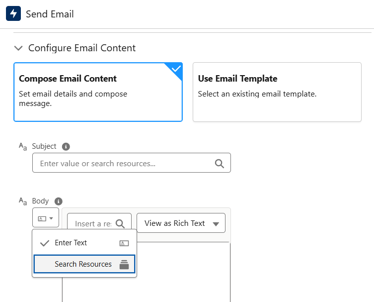 Add the Send Email action and give it a label + description. Under Configure Email Content, make sure Enter Text is selected. This gives us a rich-text-enabled email composer, straight from the element configuration!
