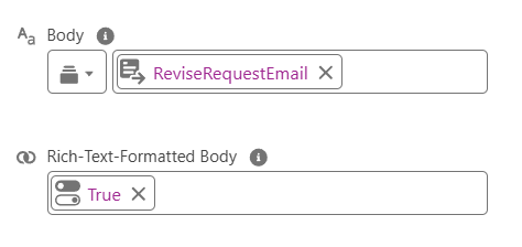 Below this is the rich-text-formatted Body parameter. Depending on whether your text template contains rich text or plain text, you can set this to either true or false, respectively.
