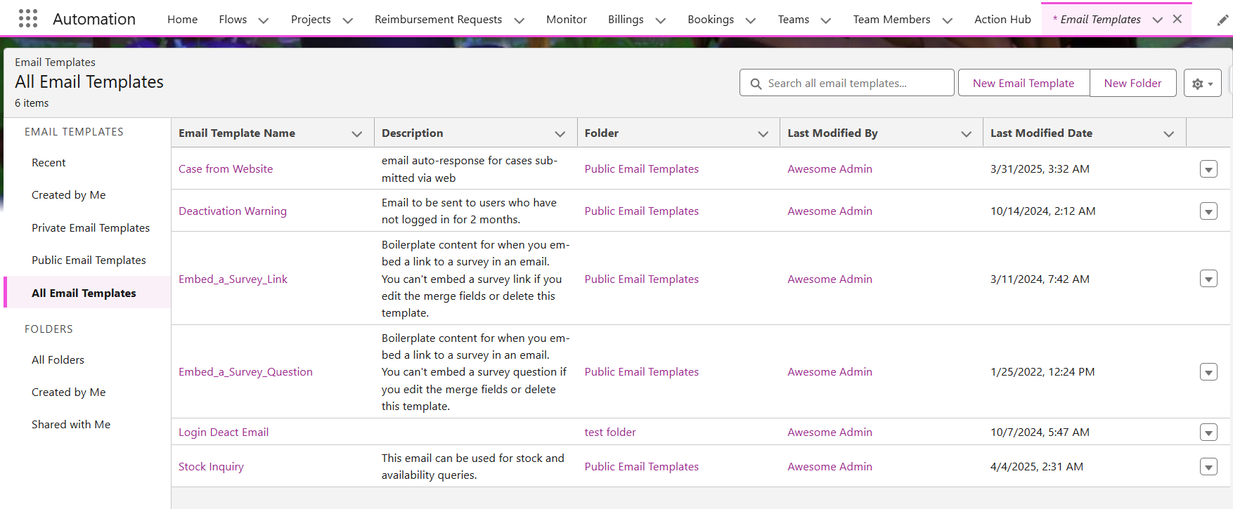 From the App Launcher, select Email Templates. Verify if you already have an email template you’d like to use, or click New Email Template on the upper right to create a new one. Email template folders are on the left side of the screen.