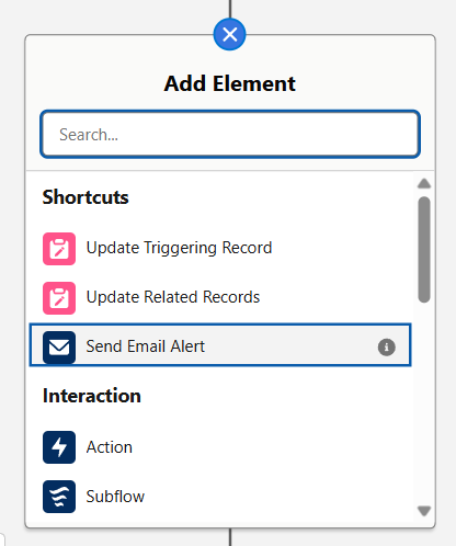 Once that’s done, jump into Flow Builder and start creating your Flow. To add an email alert, click the plus sign and look for the Send Email Alert action.