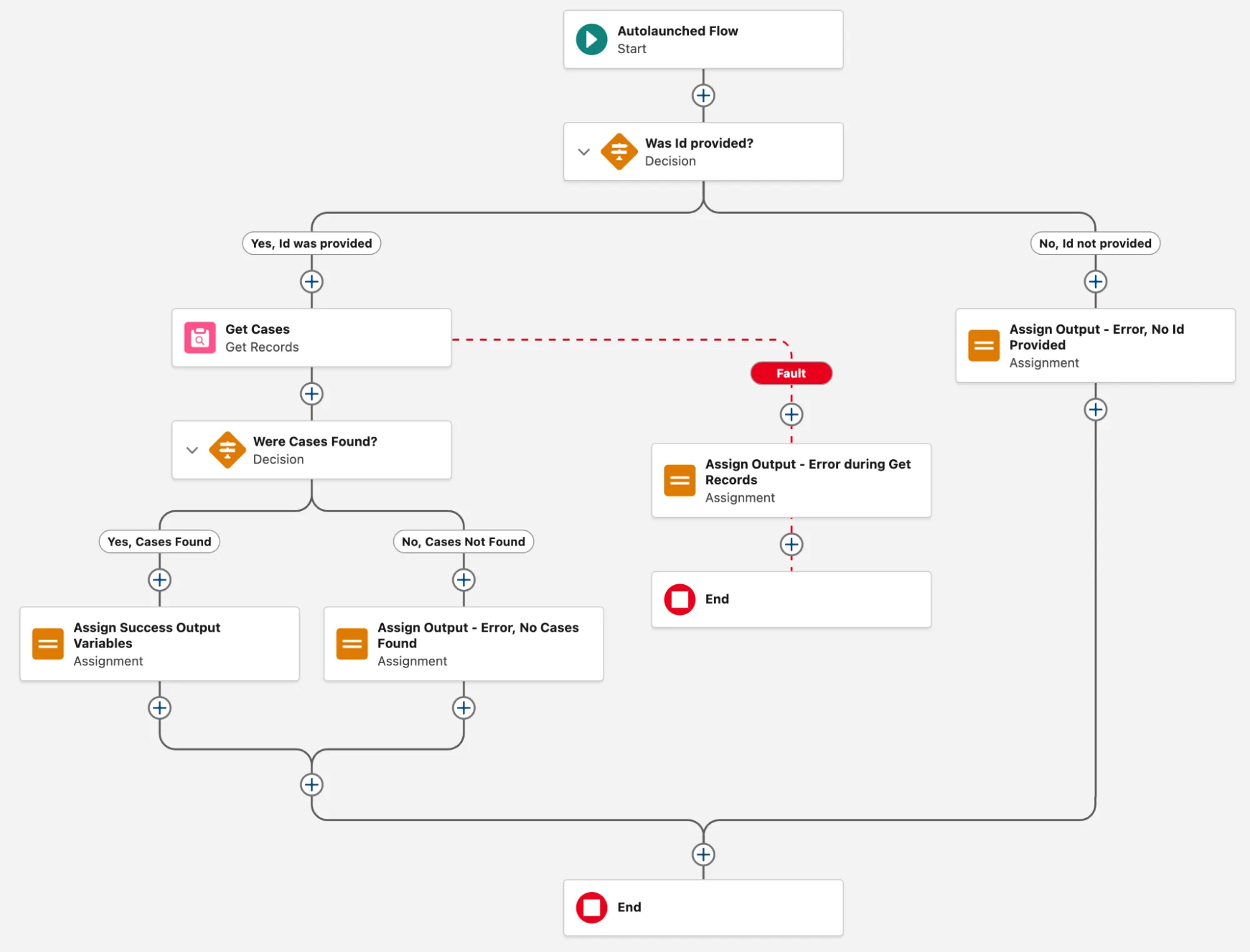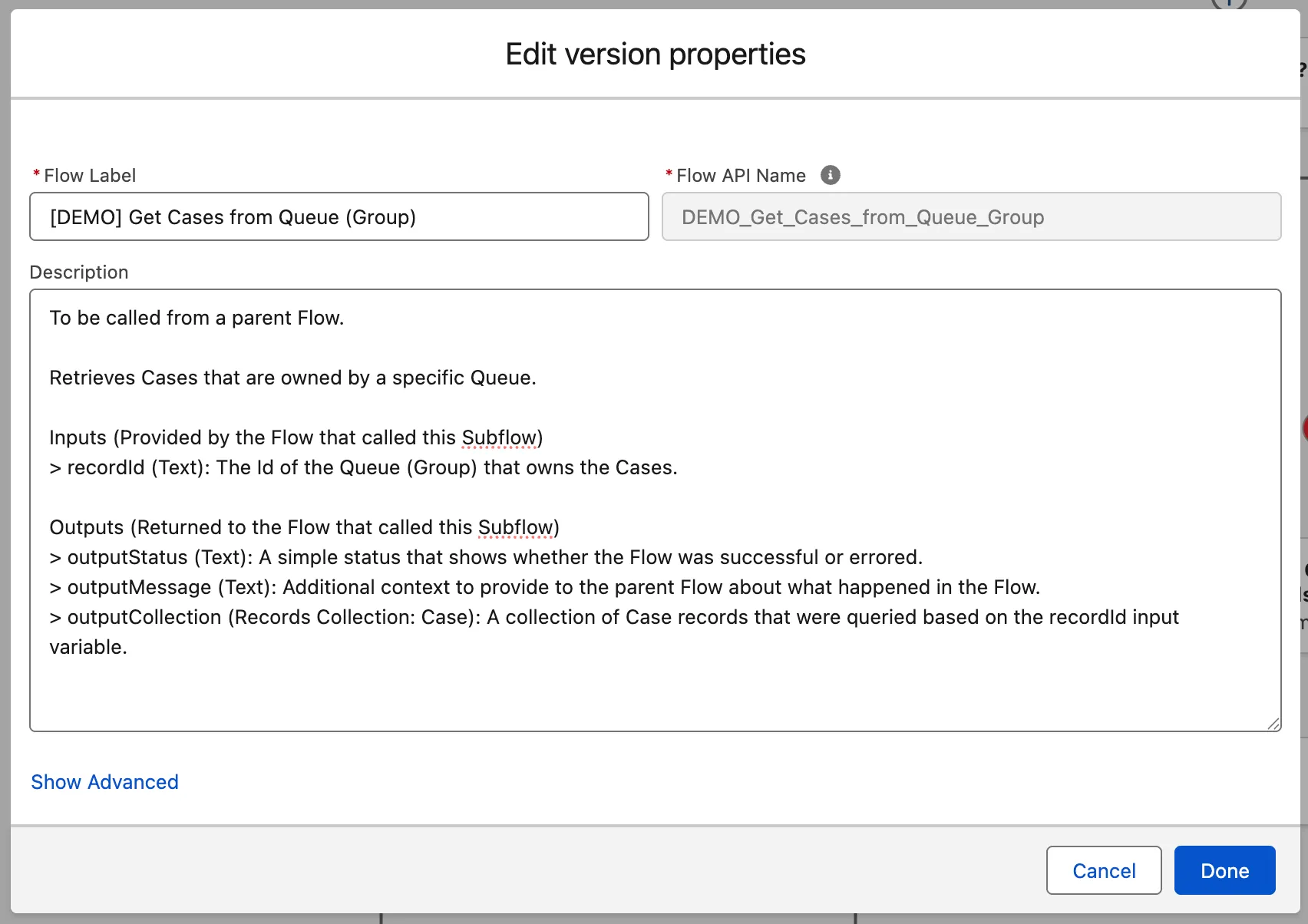 Let’s go through an example together. Below is a Flow called Get Cases from Queue (Group) that is designed to be a Subflow. You would call this Flow from another, pass in the Id of the Queue that you want to retrieve Case records for (where the Queue is the Owner of the Case), and the Flow would return a collection of Case records.