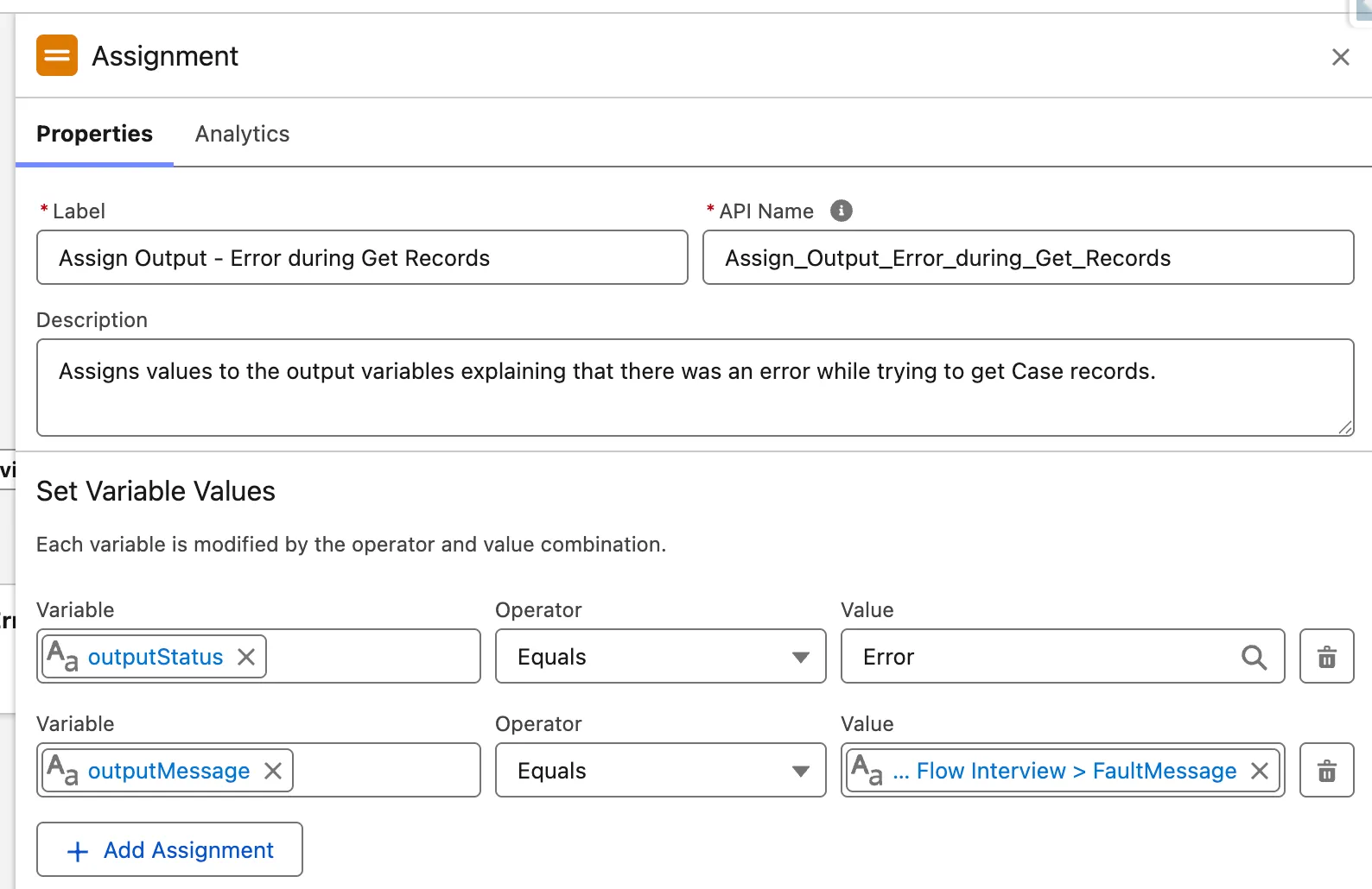 Additionally, you can see that each of the description fields for the elements within the Flow also have detailed explanations of what is being done. For example, below shows the Assignment element that sits along the Flow path. It sets the outputStatus value to Error, and provides the FaultMessage value in the outputMessage variable.