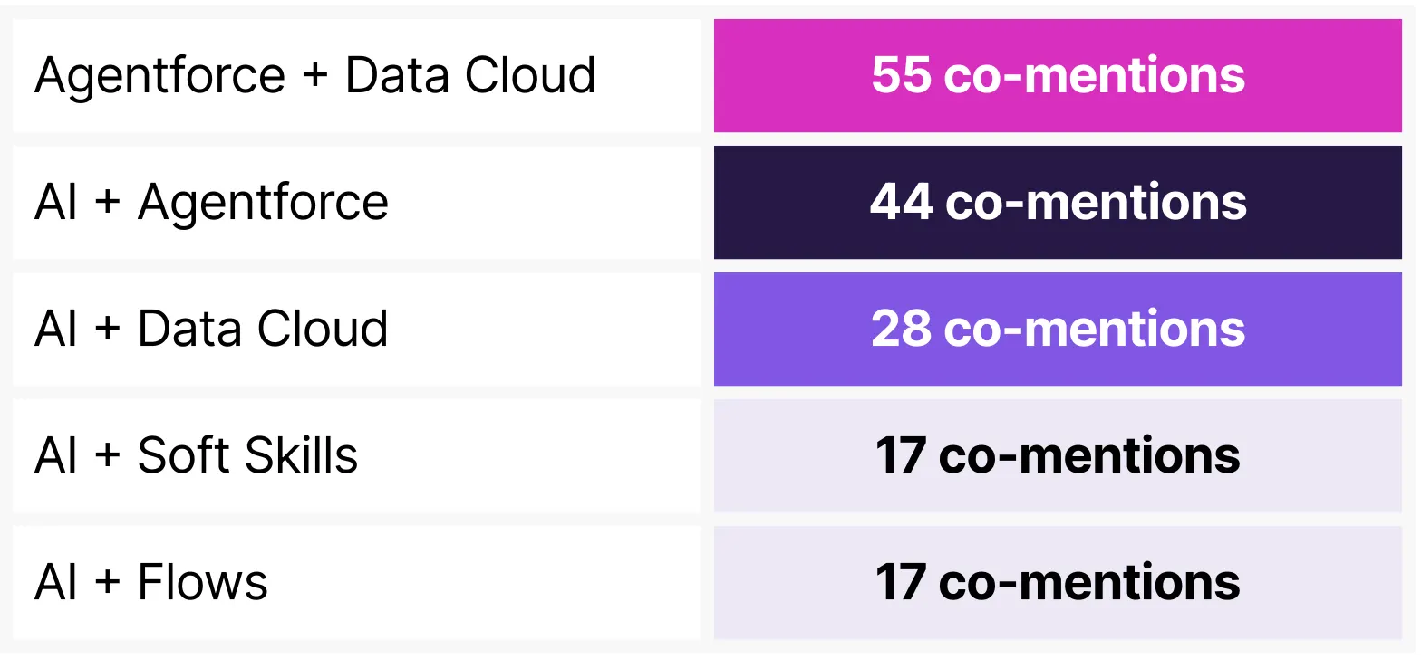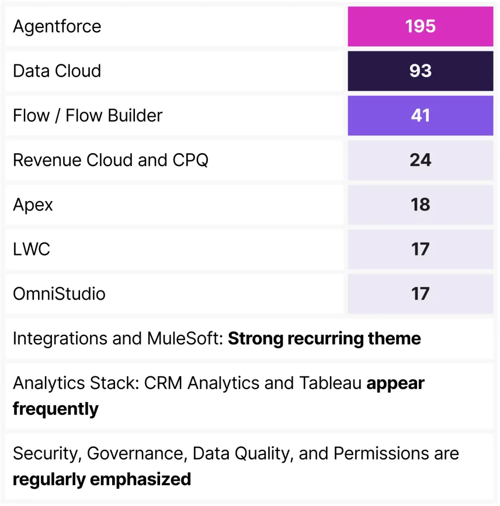 Keyword analysis tells a similar story, with Agentforce emerging as the most-cited keyword, followed by Data Cloud and Flow. AI-powered automation is growing more important, as is data infrastructure, and platform-level orchestration in modern Salesforce projects.