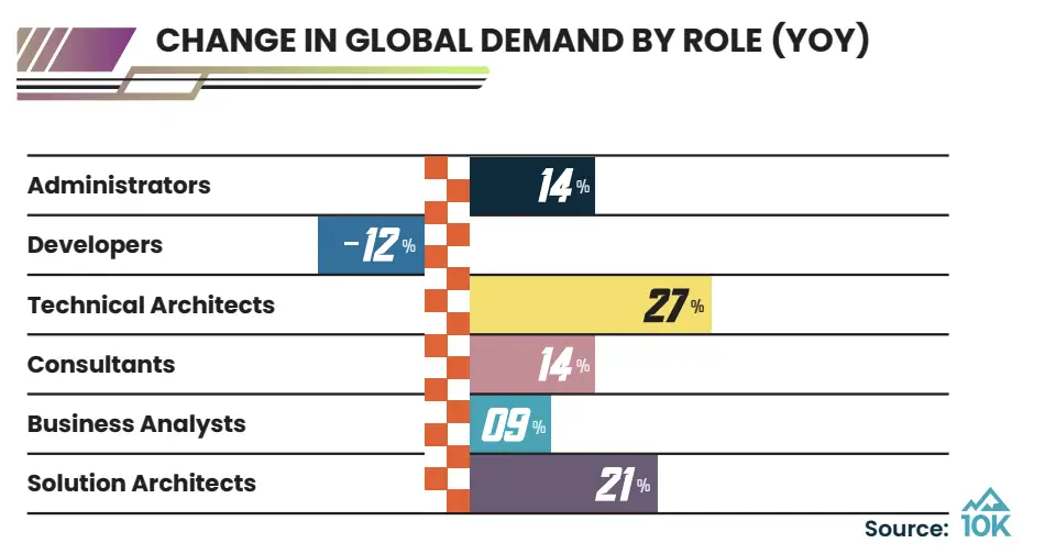 According to the 10k’s 2025 Salesforce Ecosystem Report, demand for technical architects rose 27% globally, while solution architect demand increased by 21%. Meanwhile, demand for Salesforce Developers declined by around 12% – indicating that there’s a shift in the types of technical expertise that companies are looking for.